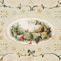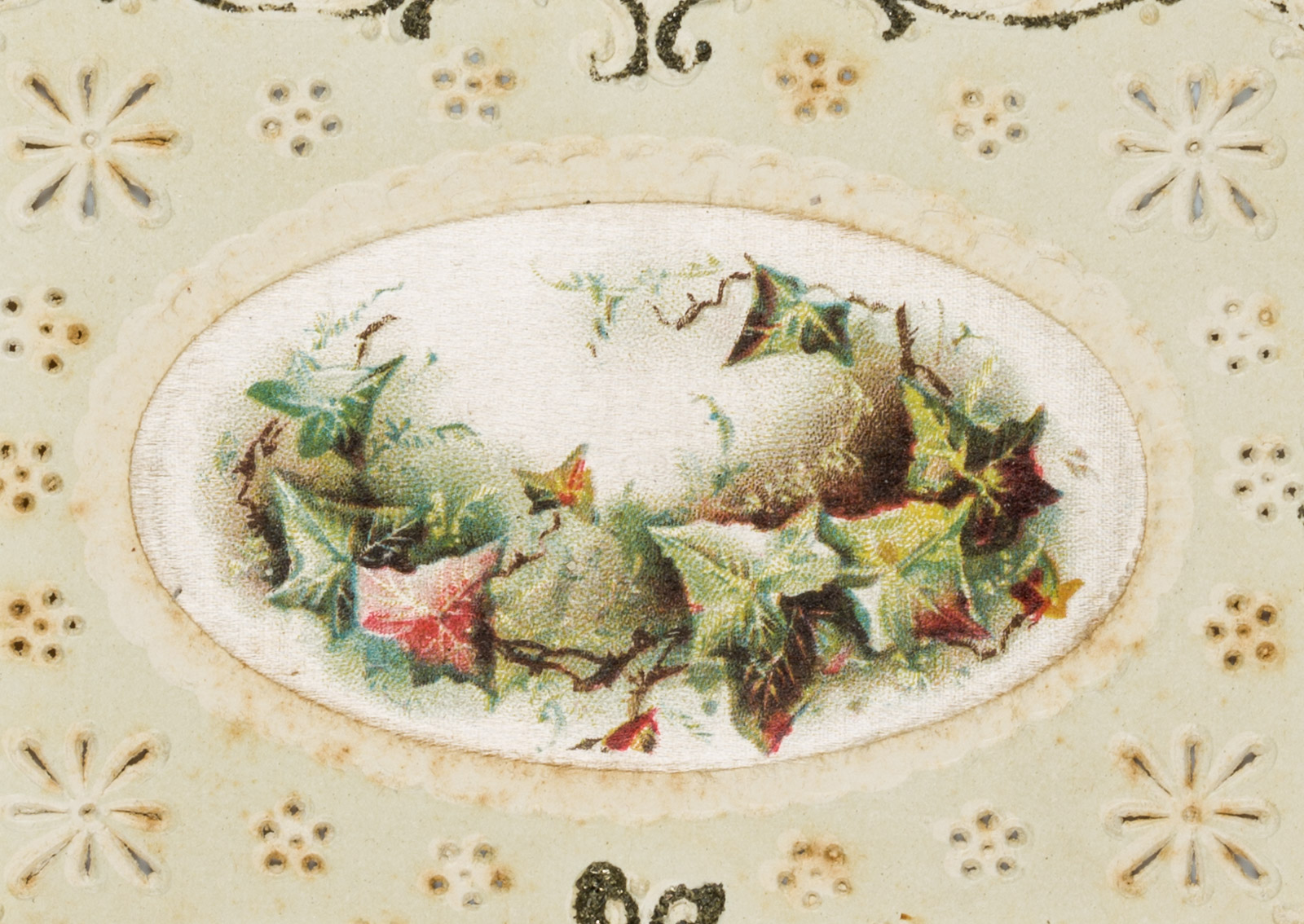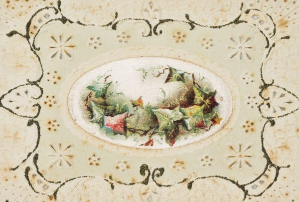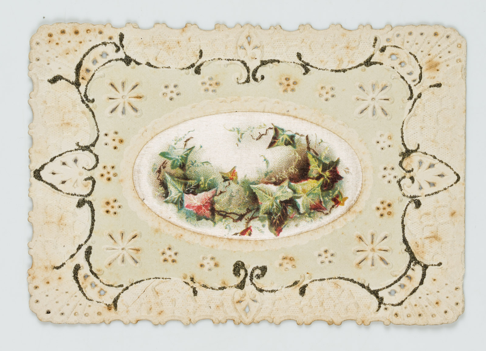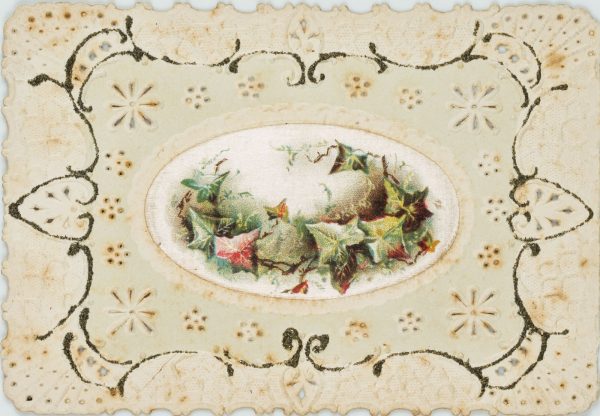 - Description: Beautiful filigree paper lace; openwork card backed with silk and tinsel; ivy motif.