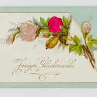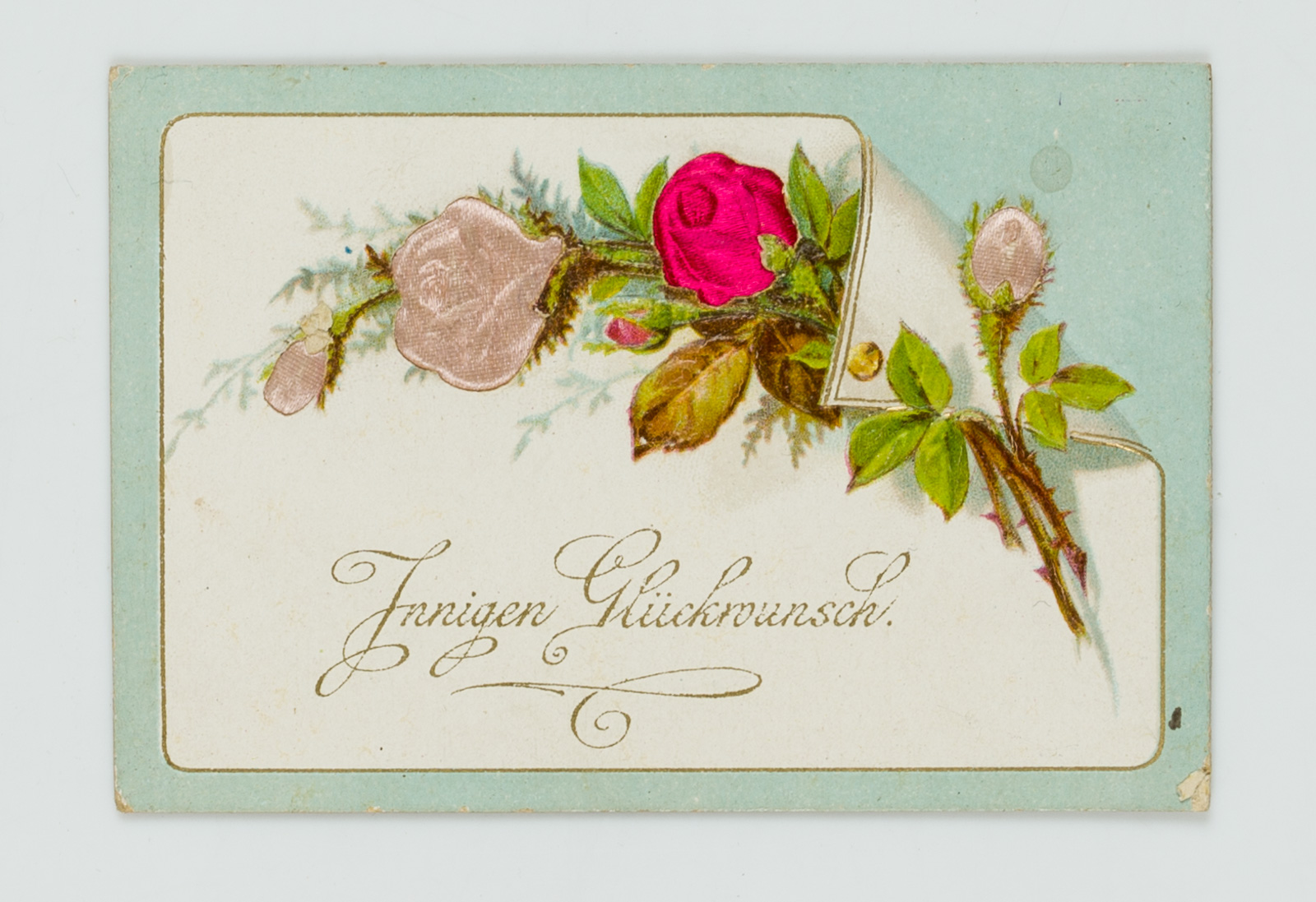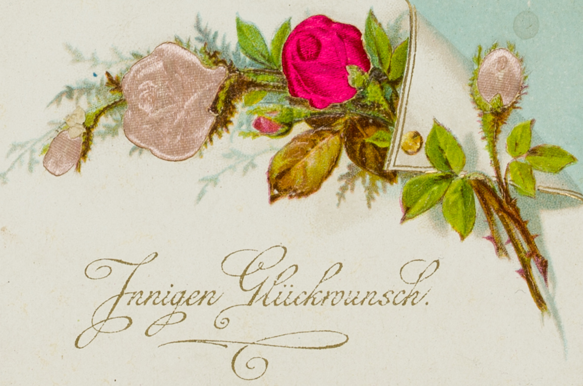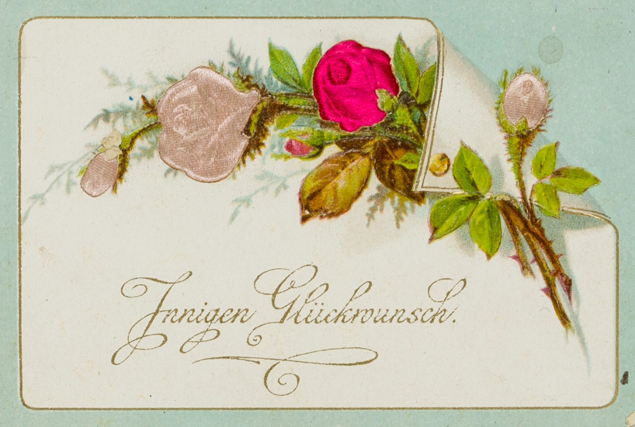 Unbekannt (20. Jahrhundert), Karte mit Rosen und Seidenapplikationen, um 1900, Glückwunschbillet