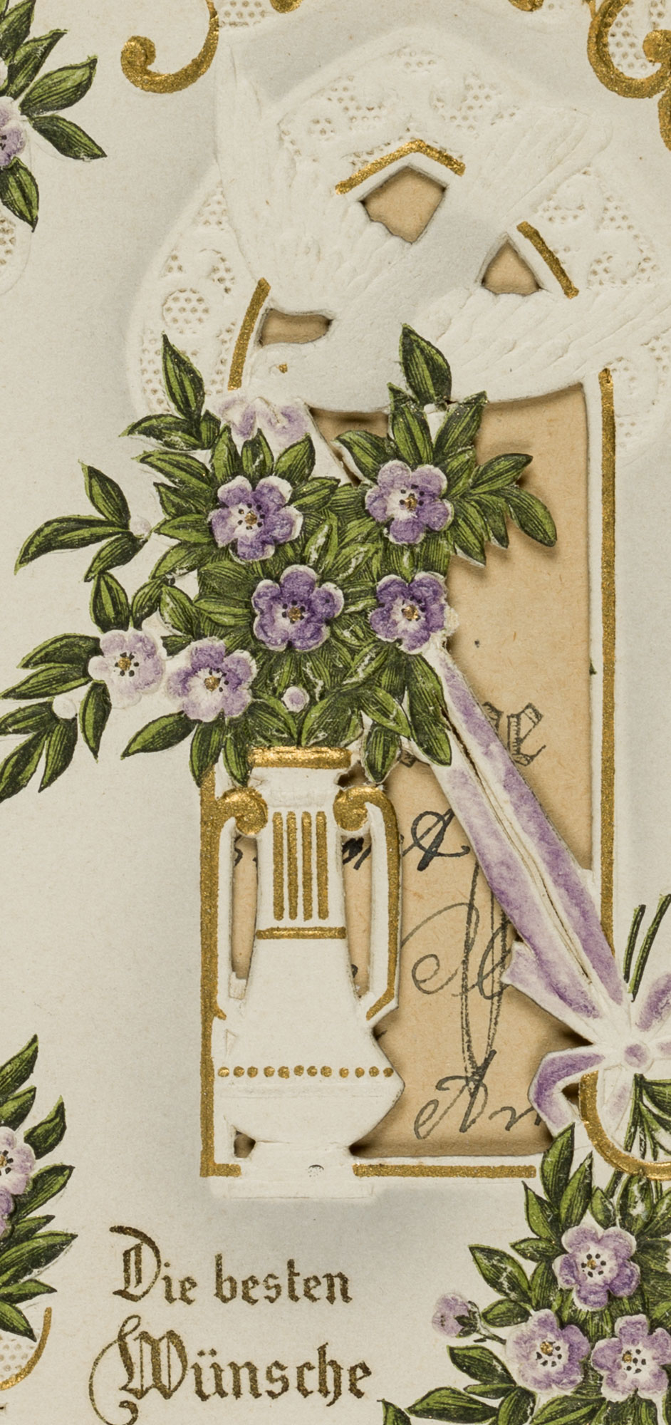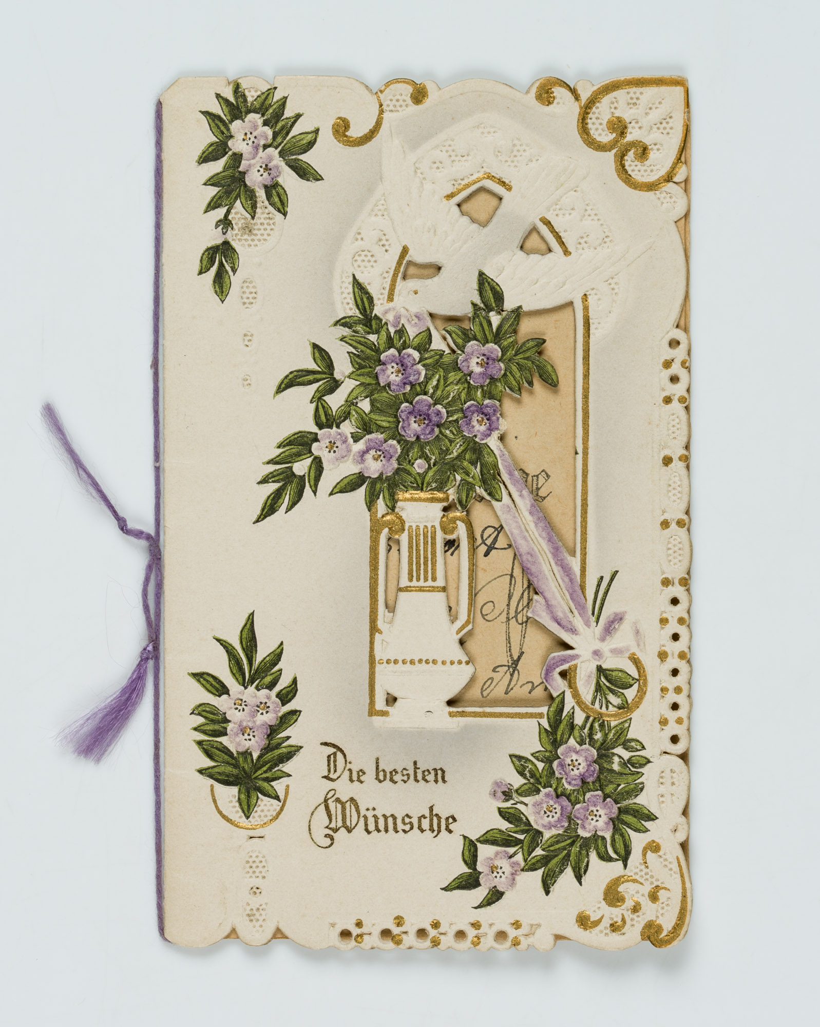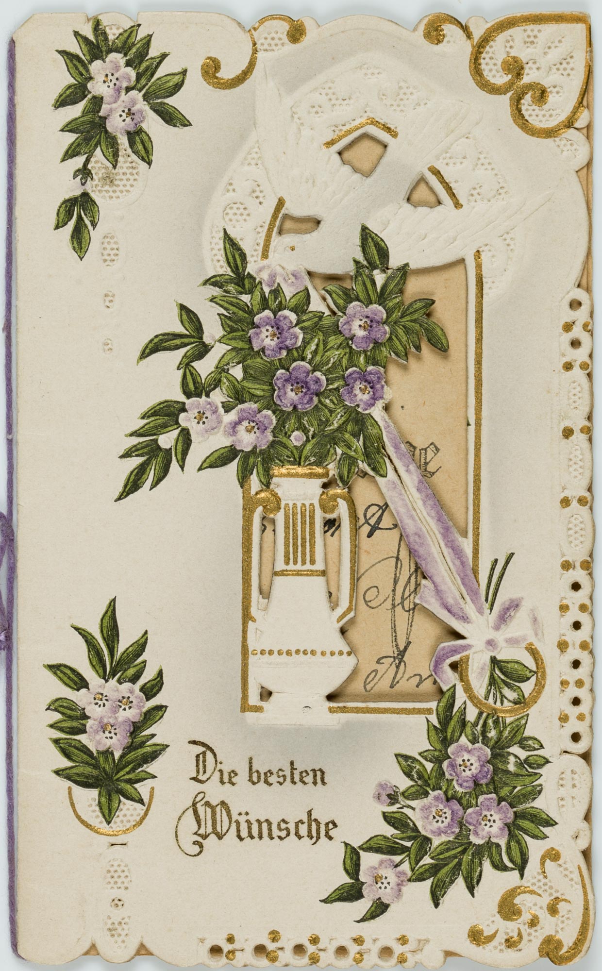 - Description: Coloured relief printing. Very beautiful birthday greeting card with die-cut dove and blossoms; it was worked with very filigree openings; Attached double sheet with printed congratulations; handwritten greetings in ink.