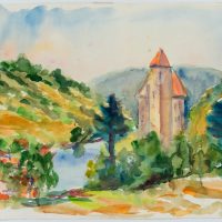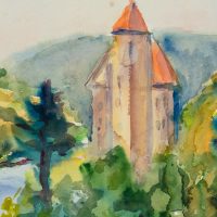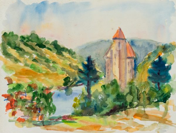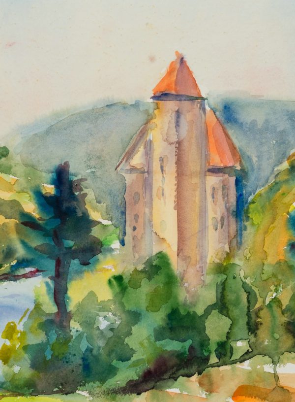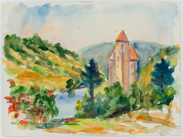 Unknown (20th century), Church in the peaceful valley, large format, , Watercolor