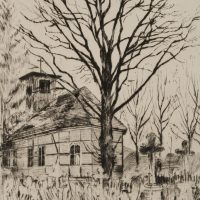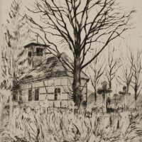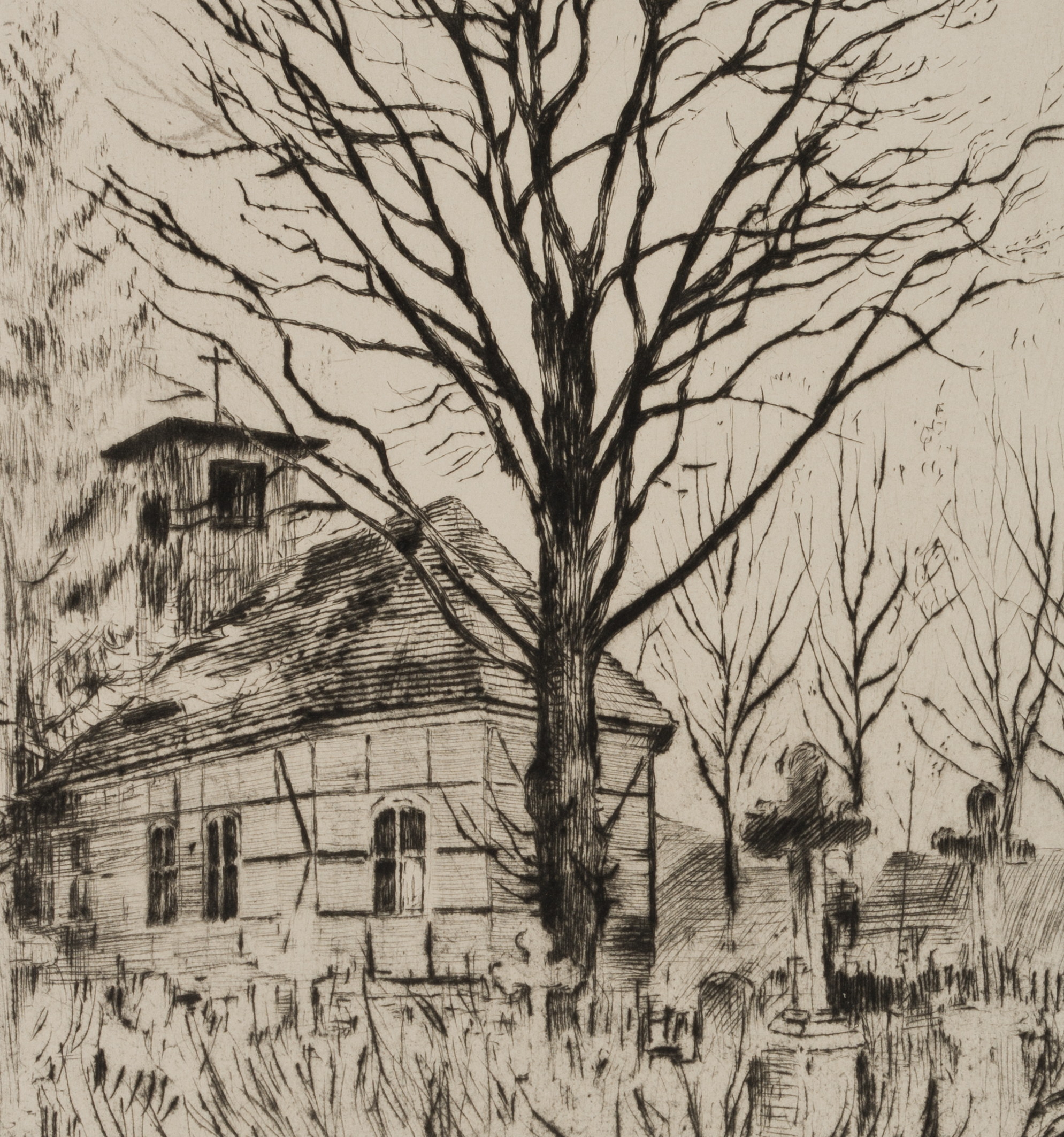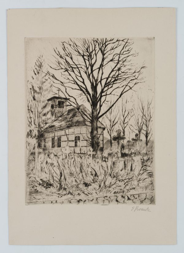Unbekannt (20. Jahrhundert), Blick über den Friedhof vor der Fachwerkkirche mit großem Baum im Winter, um 1900, Radierung