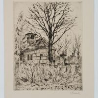 Unknown (20th century), View over the cemetery in front of the half-timbered church with large tree in winter, c. 1900, Etching