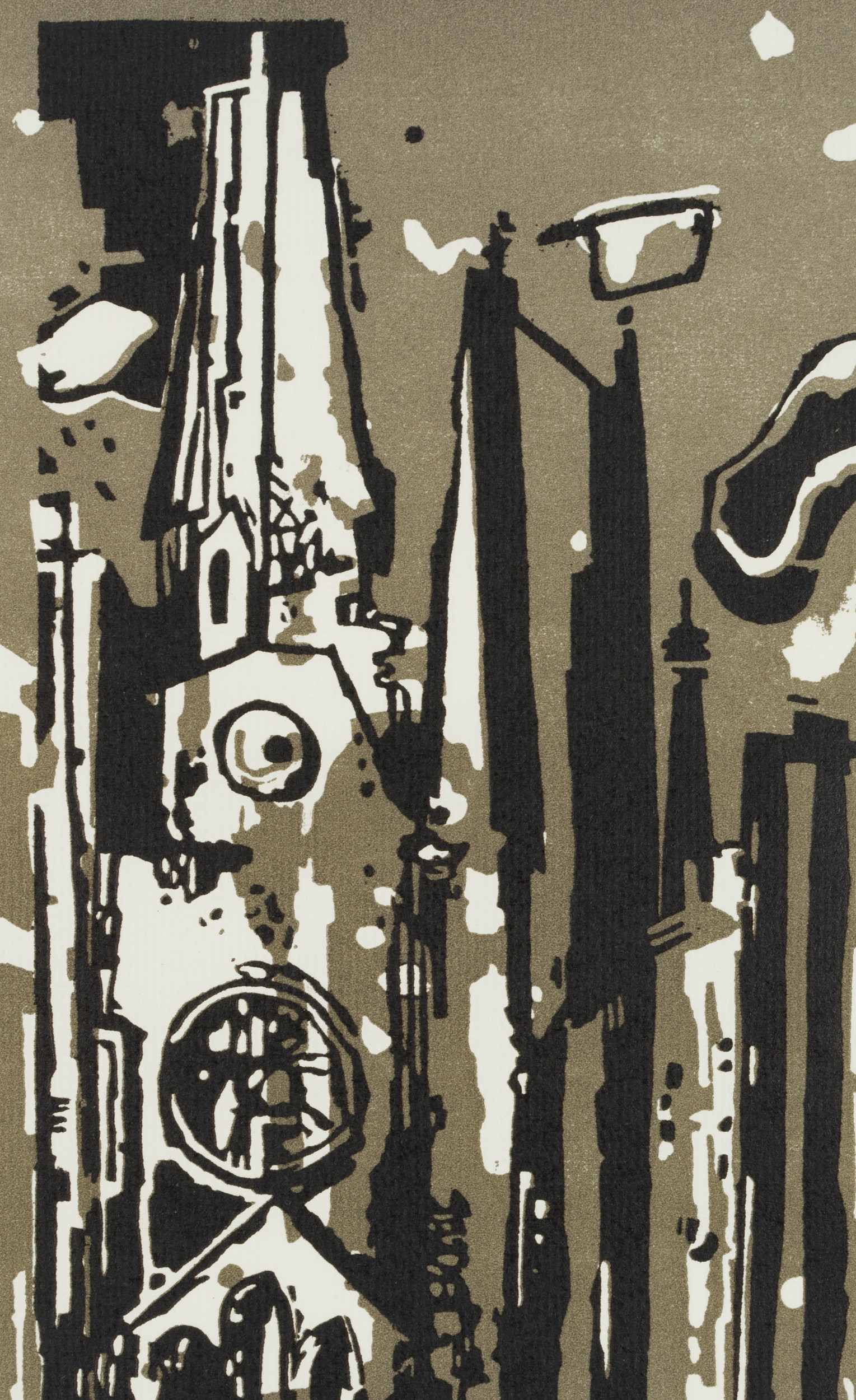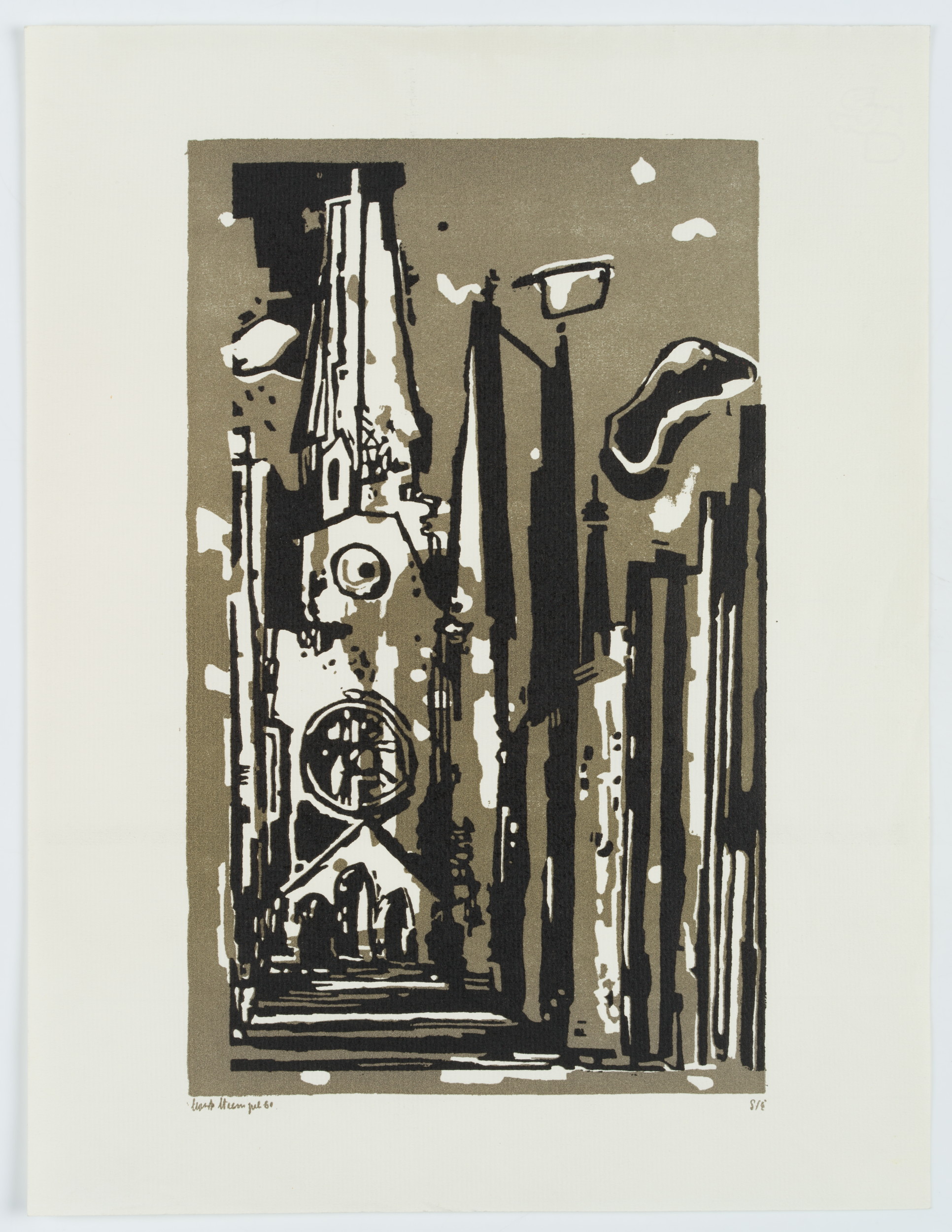 Unknown (20th century), View of a church with a large rose window, Expressionist depiction, c. 1960, Color woodcut