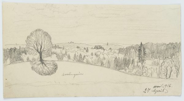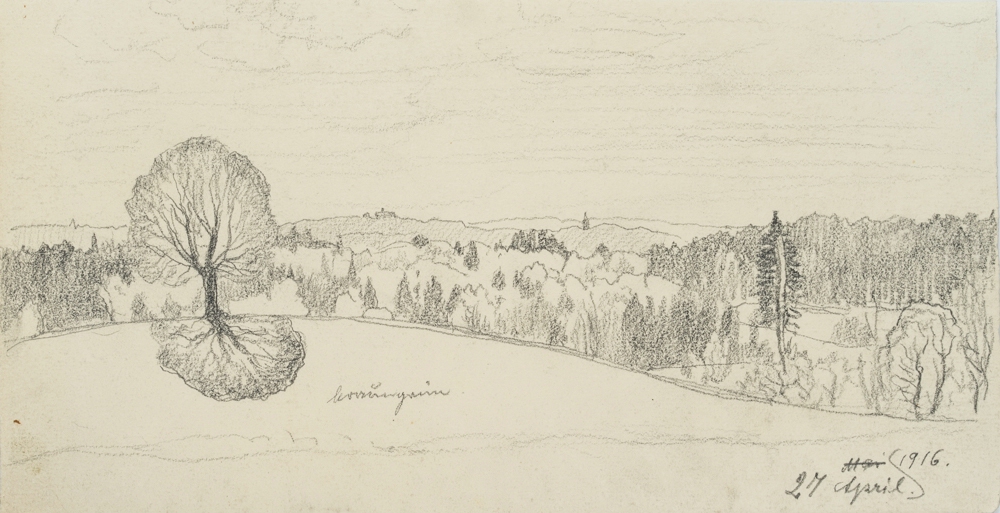 Unbekannt (20. Jahrhundert), Landschaftsstudie mit bewaldeten Hügeln, 1916, Bleistift