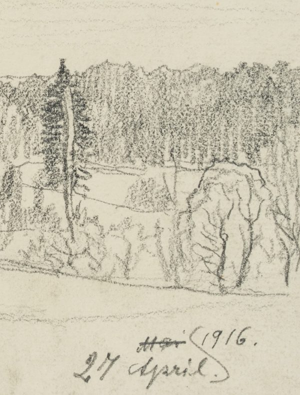 - Bezeichnung: Unten rechts ist das Blatt datiert auf “27 April 1916”, das Datum ist offenbar später vom Künstler beschrieben und nochmals korrigiert worden.