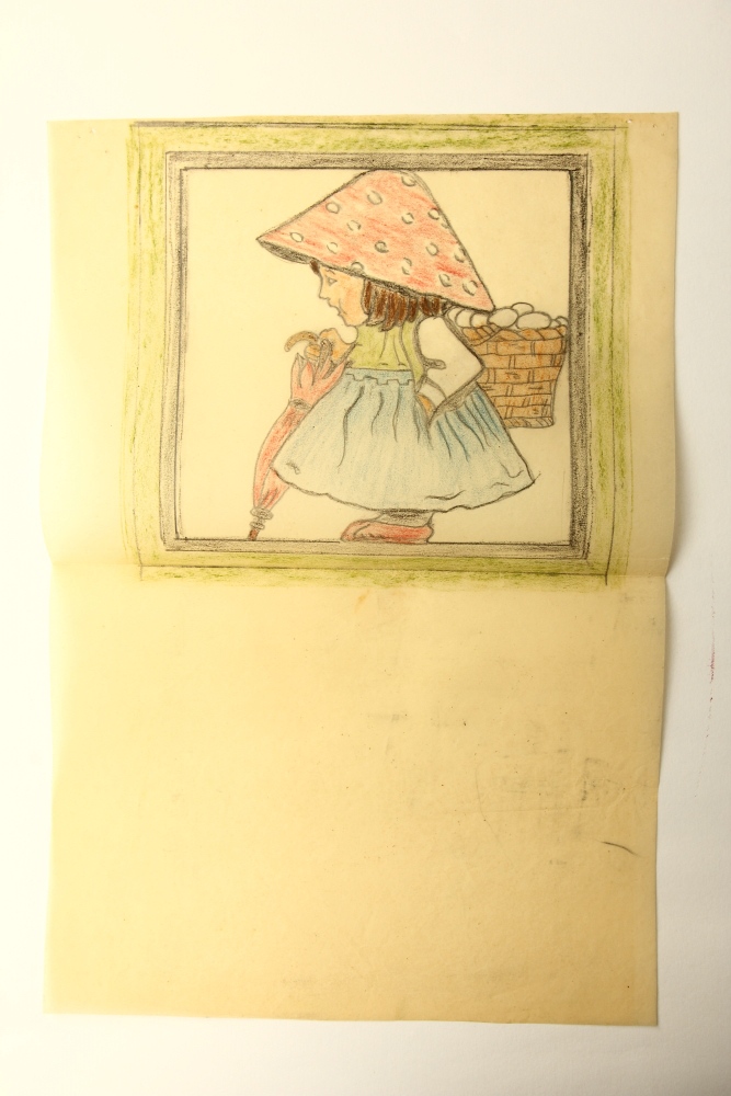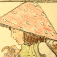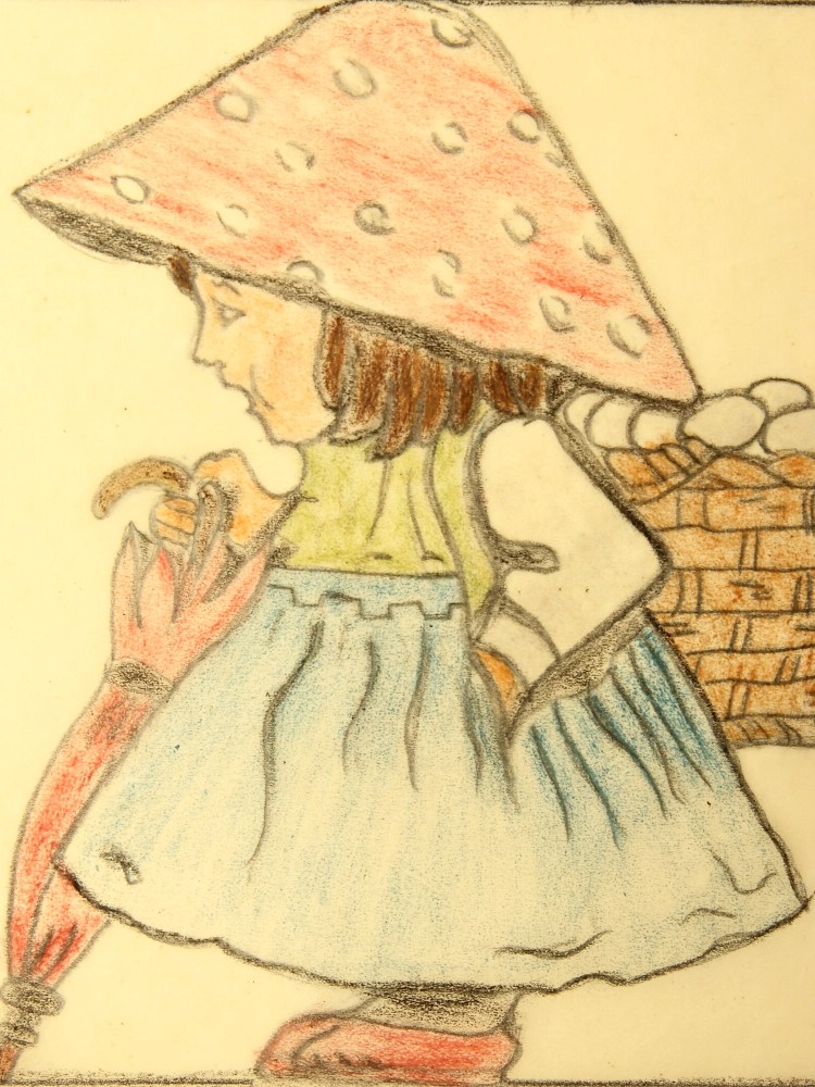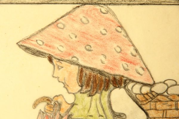 Unbekannt (20. Jahrhundert), Mädchen mit Pilzhut und Korb auf dem Rücken, Simplicissimus, , Buntstift