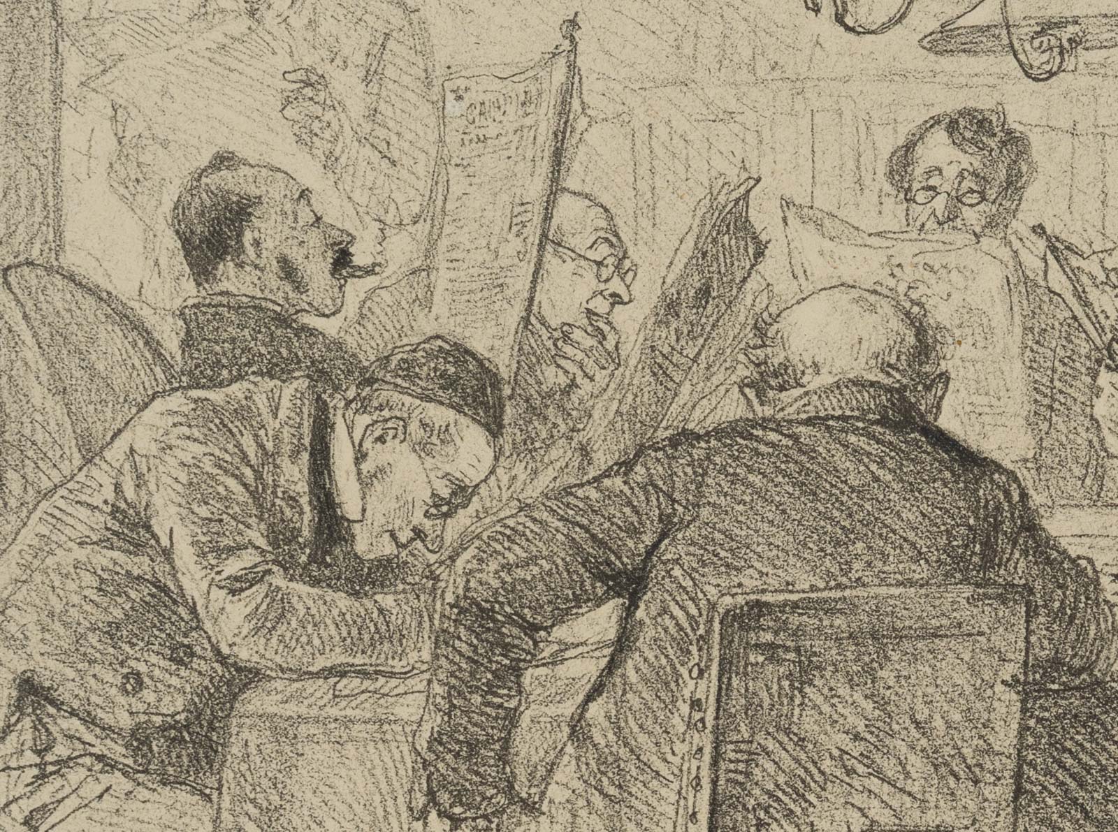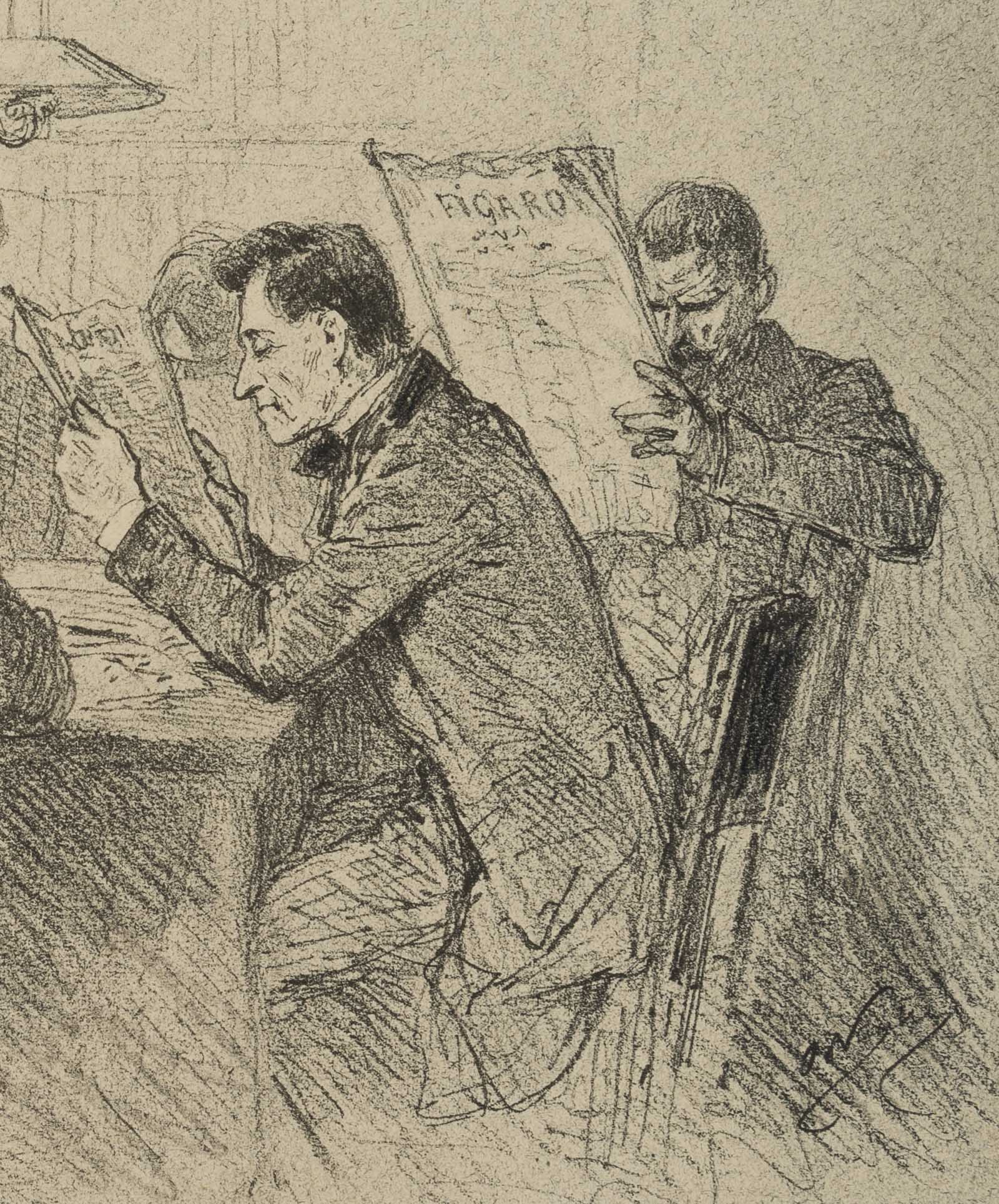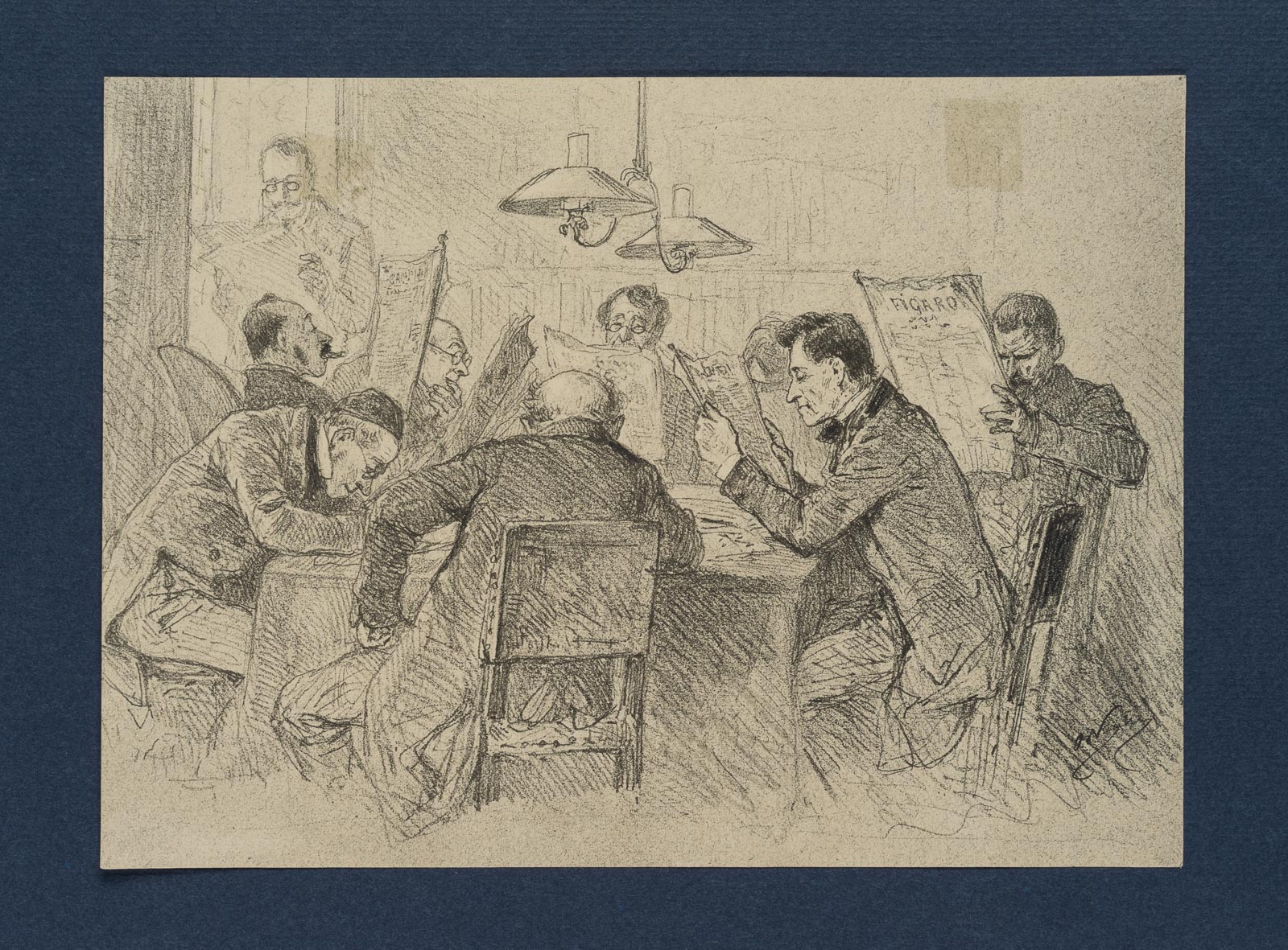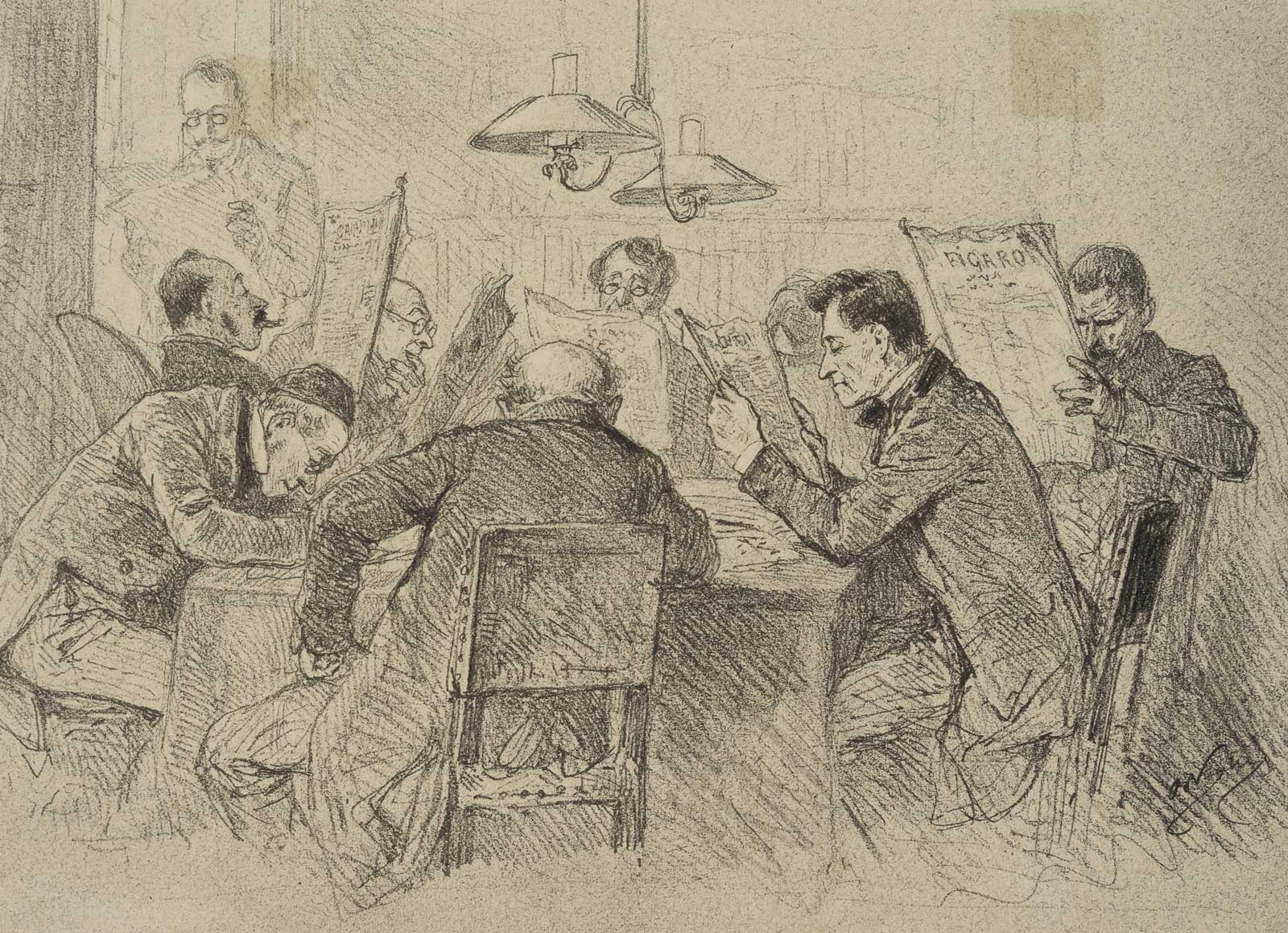 - Description: Eight men sitting around a square table, engrossed in the French daily newspaper Le Figaro.