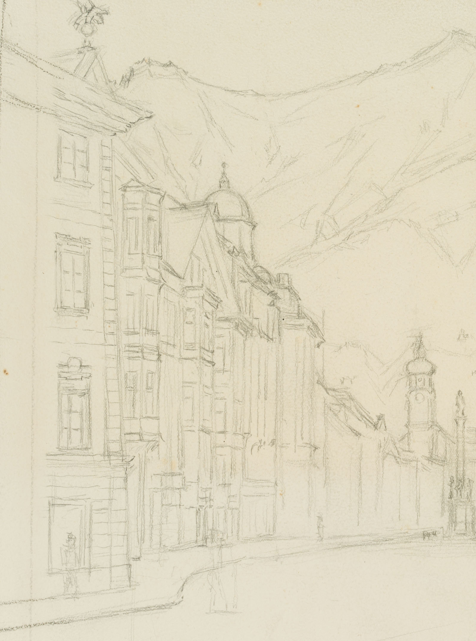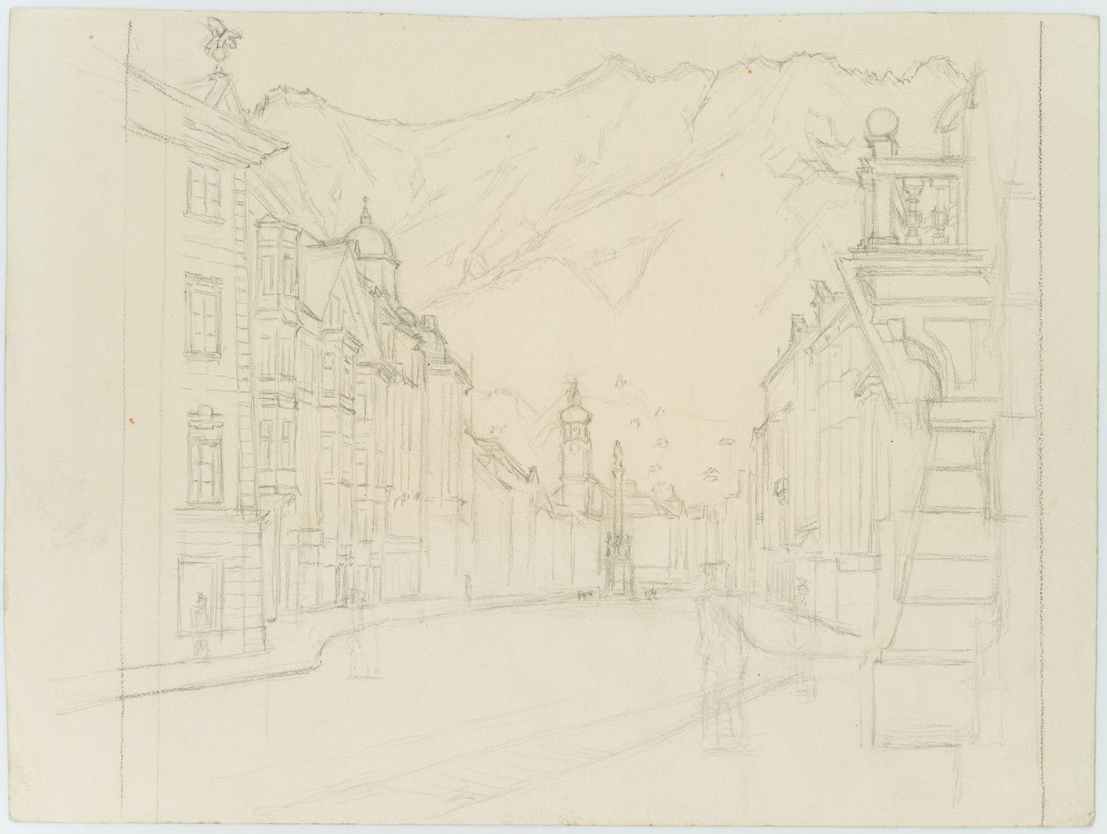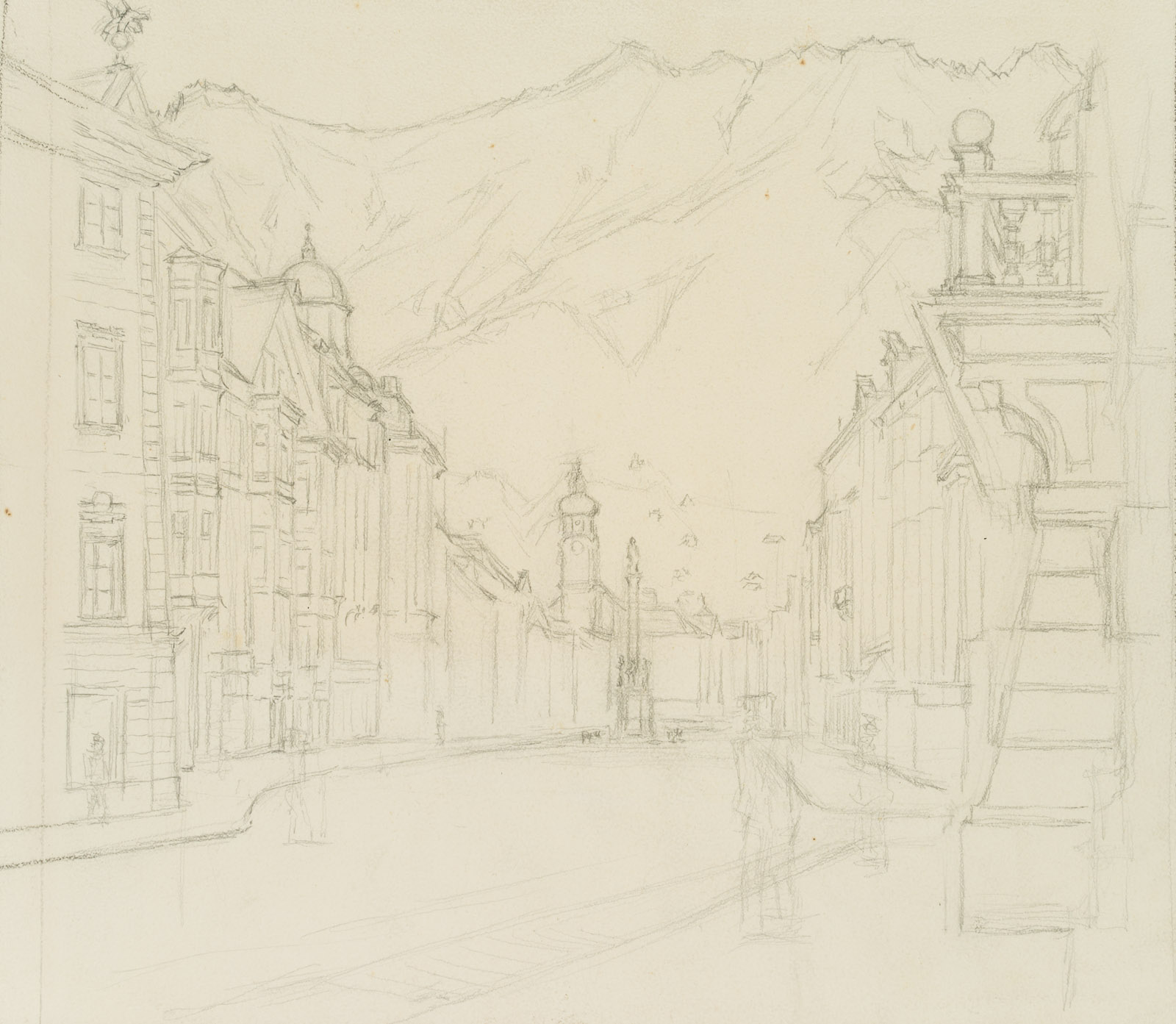 Unbekannt (20. Jahrhundert), Maria-Theresia-Straße mit Annasäule in Innsbruck, , Bleistift