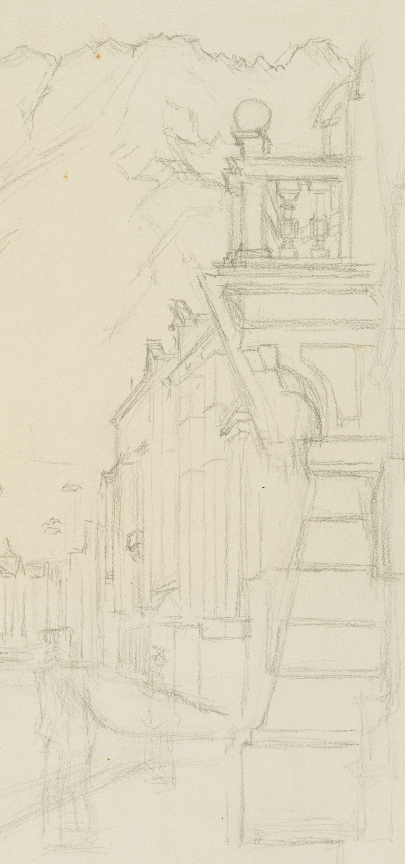 - Beschreibung: Ohne Bezeichnung. Blick in einen Straßenzug, der zu beiden Seiten von Häusern gesäumt wird. Die zum Teil prachtvollen Fassaden der Architektur sind aufmerksam wiedergegeben. Im Hintergrund ist eine Säule mit Standbild zu erkennen, gleich dahinter ein Kirchturm. Im Horizont dann ein beeindruckendes Alpenpanorama mit einer massiven Bergkette.