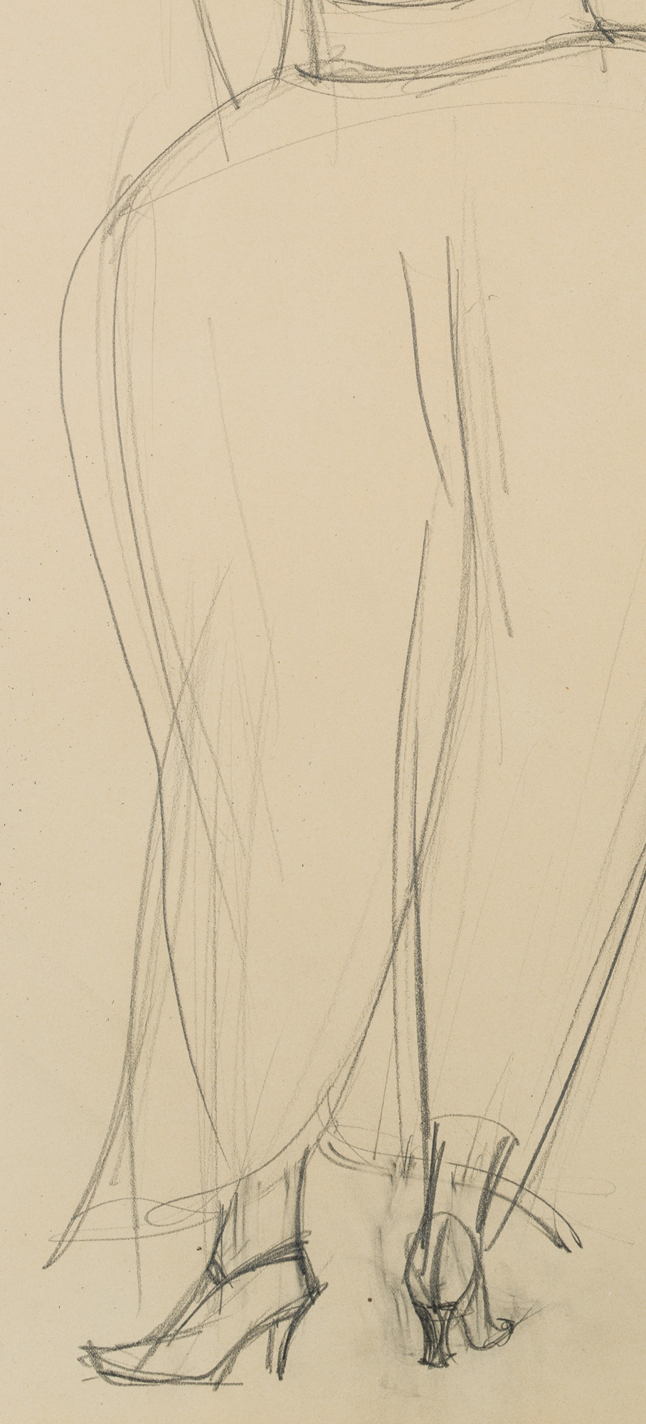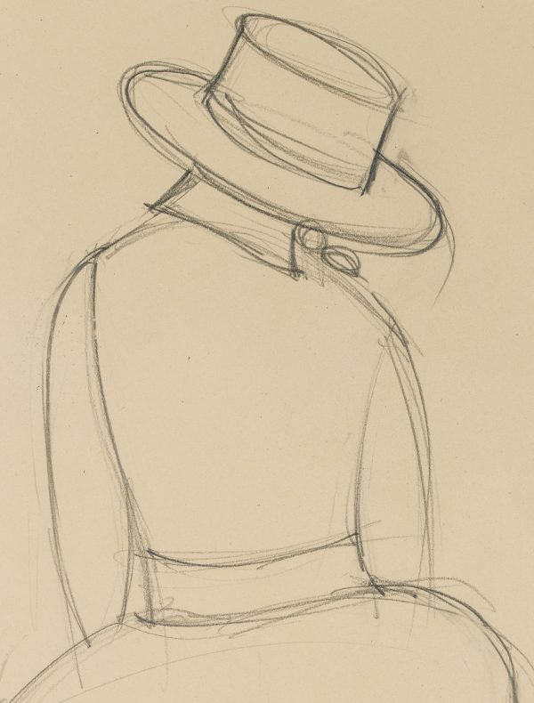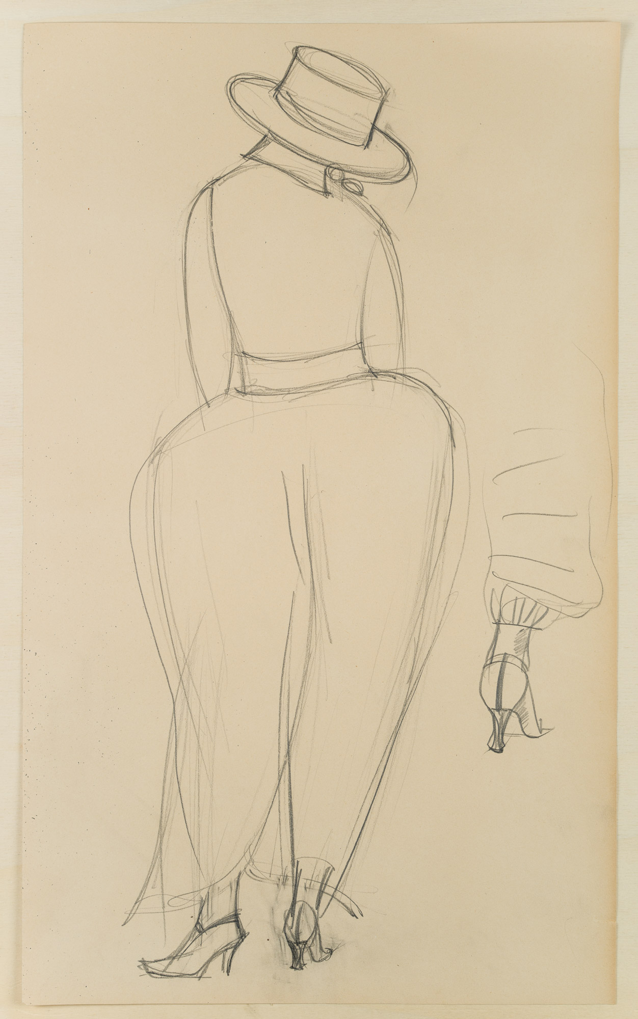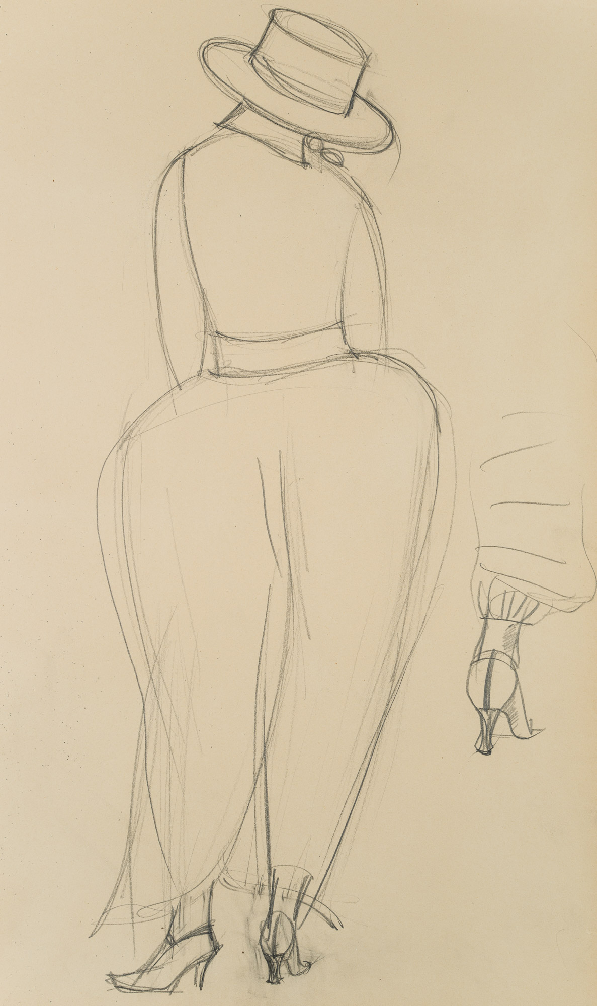 Unknown (20th century), Fashion and shoe study, lady with hat in back view, , Pencil