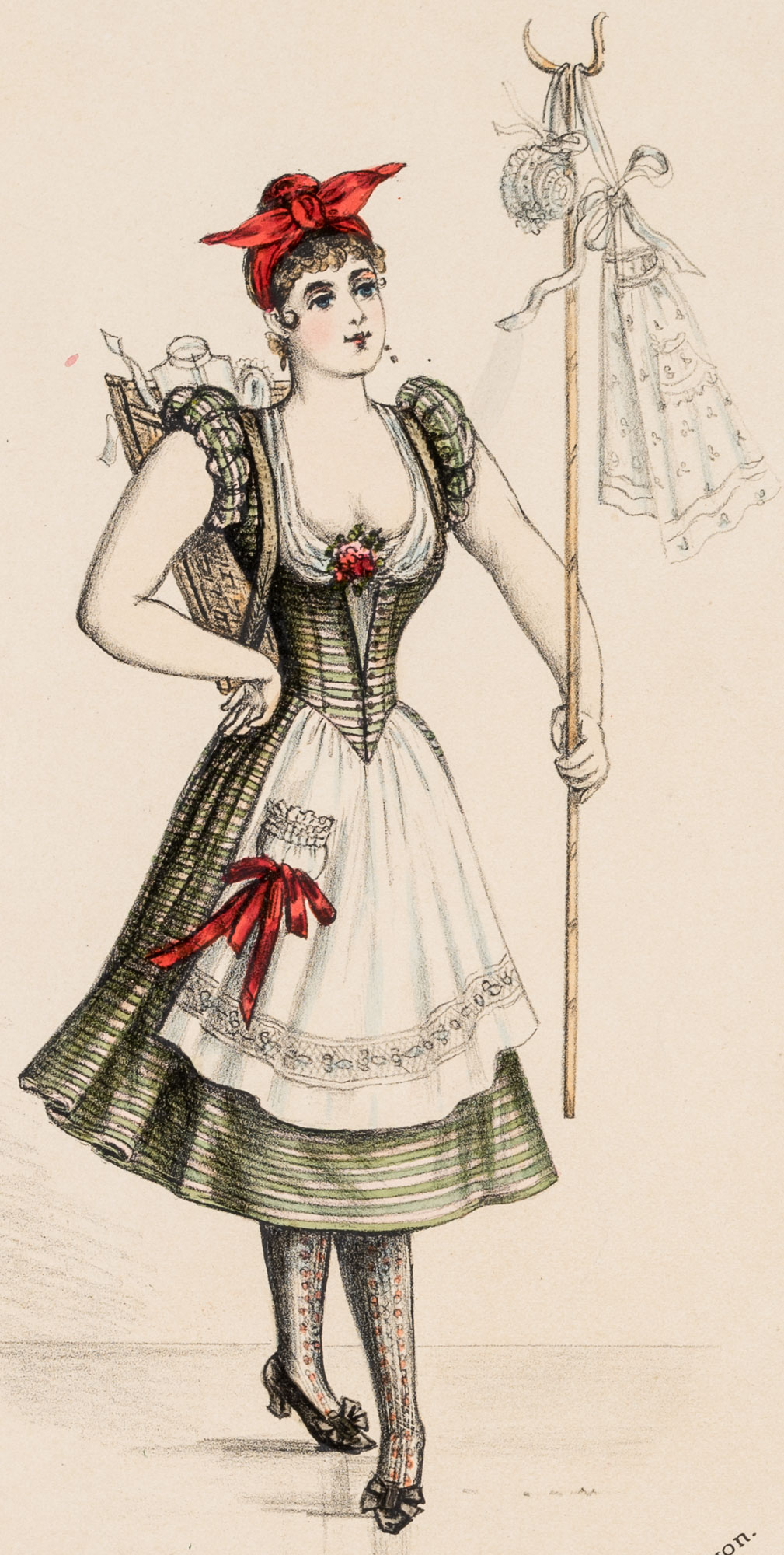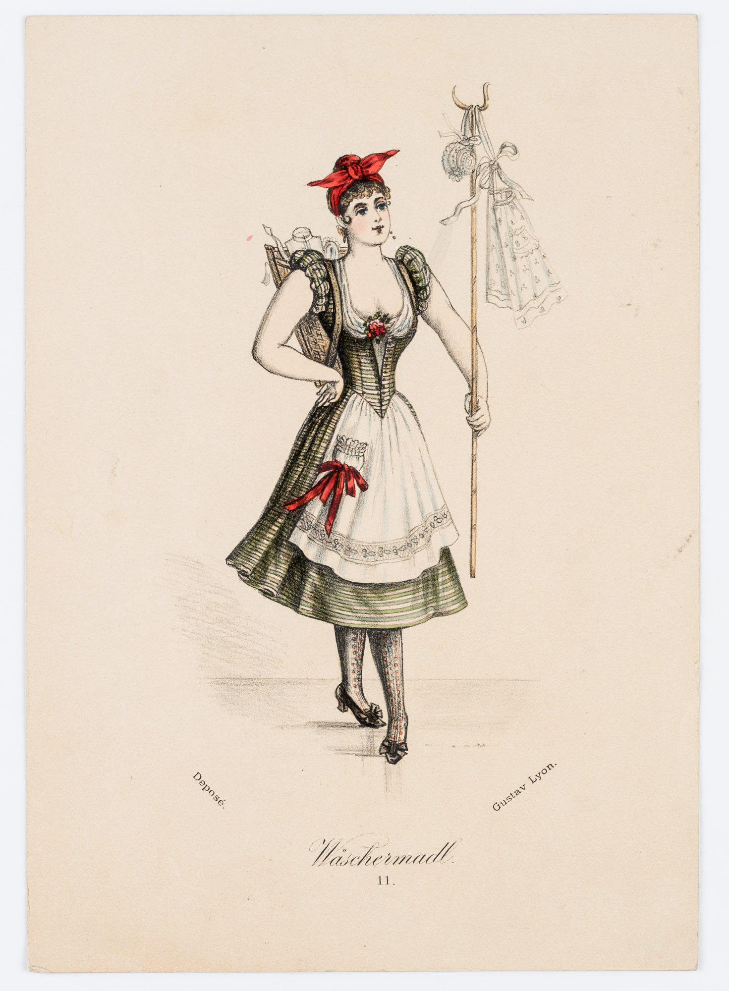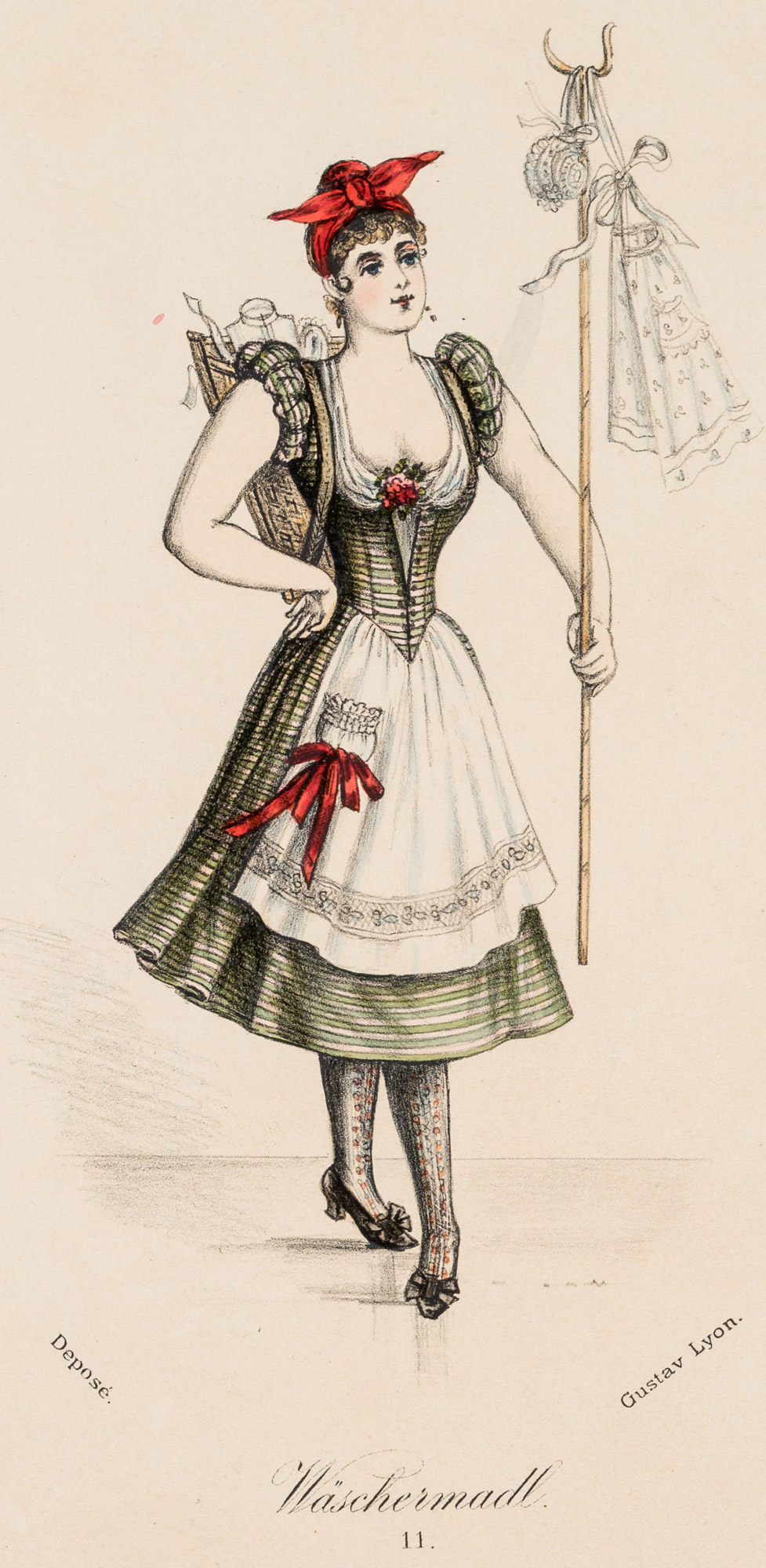 Unbekannt (20. Jahrhundert), Modeskizze, Wäschemadl, Dame im Ganzkörper in einer Tracht, um 1900, Radierung