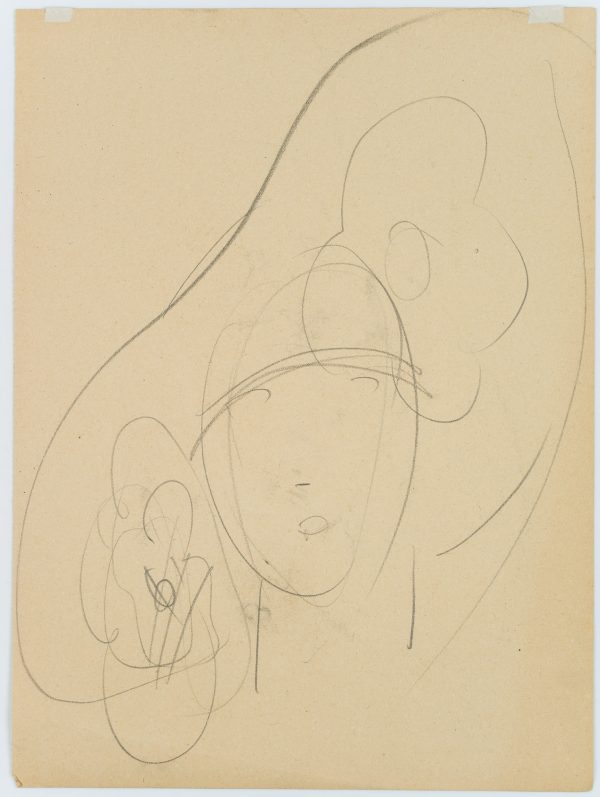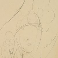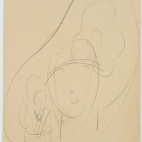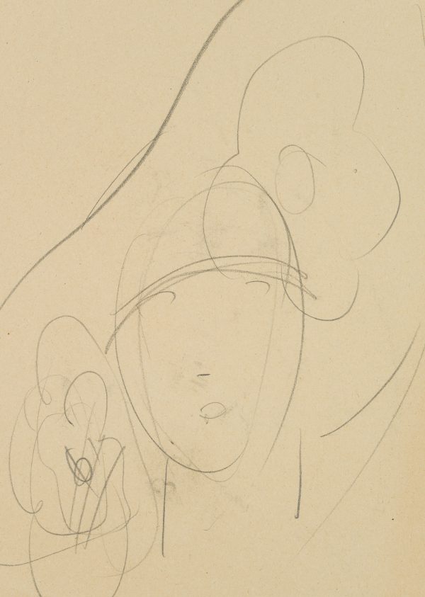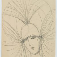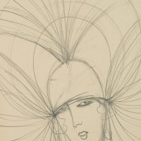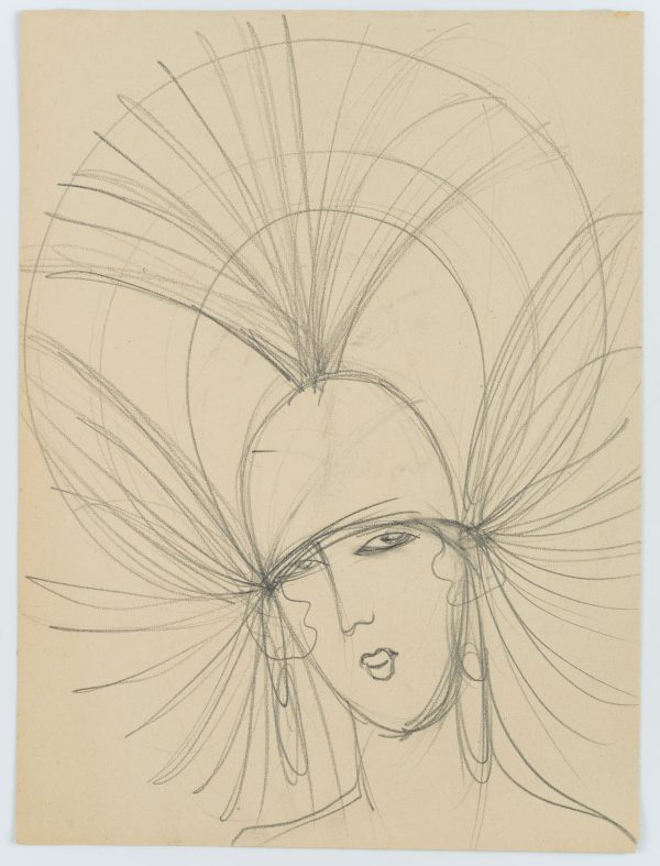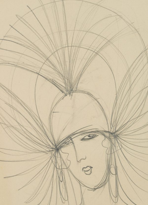 - Beschreibung: Hutstudie mit frontalem Damenporträt, einen spektakulär großen Hut tragend. Wie Strahlen führen die Streben des Hutes geschwungen vom Kopf der Dame. Rückseite: Angedeutete Skizze einer Hutstudie mit frontalem Damenporträt, einen eleganten Hut mit großer Krempe und Blüten tragend.