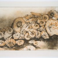 - Beschreibung: Darstellung eines Haufens von fossilen Gehäusen der Nautiloideen. Das Blatt ist m,it Klebestreifen an die Rückseite eines Passepartouts geklebt.