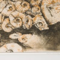 - Bezeichnung: Unten rechts signiert: “[unkenntlich]”. Unten rechts datiert: “1980”. Unten links eigenhändig bezeichnet: “Nautiloide e.a.”.
