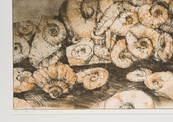 - Description: Depiction of a cluster of fossil nautiloid shells. The sheet is glued with adhesive tape to the back of a passepartout.