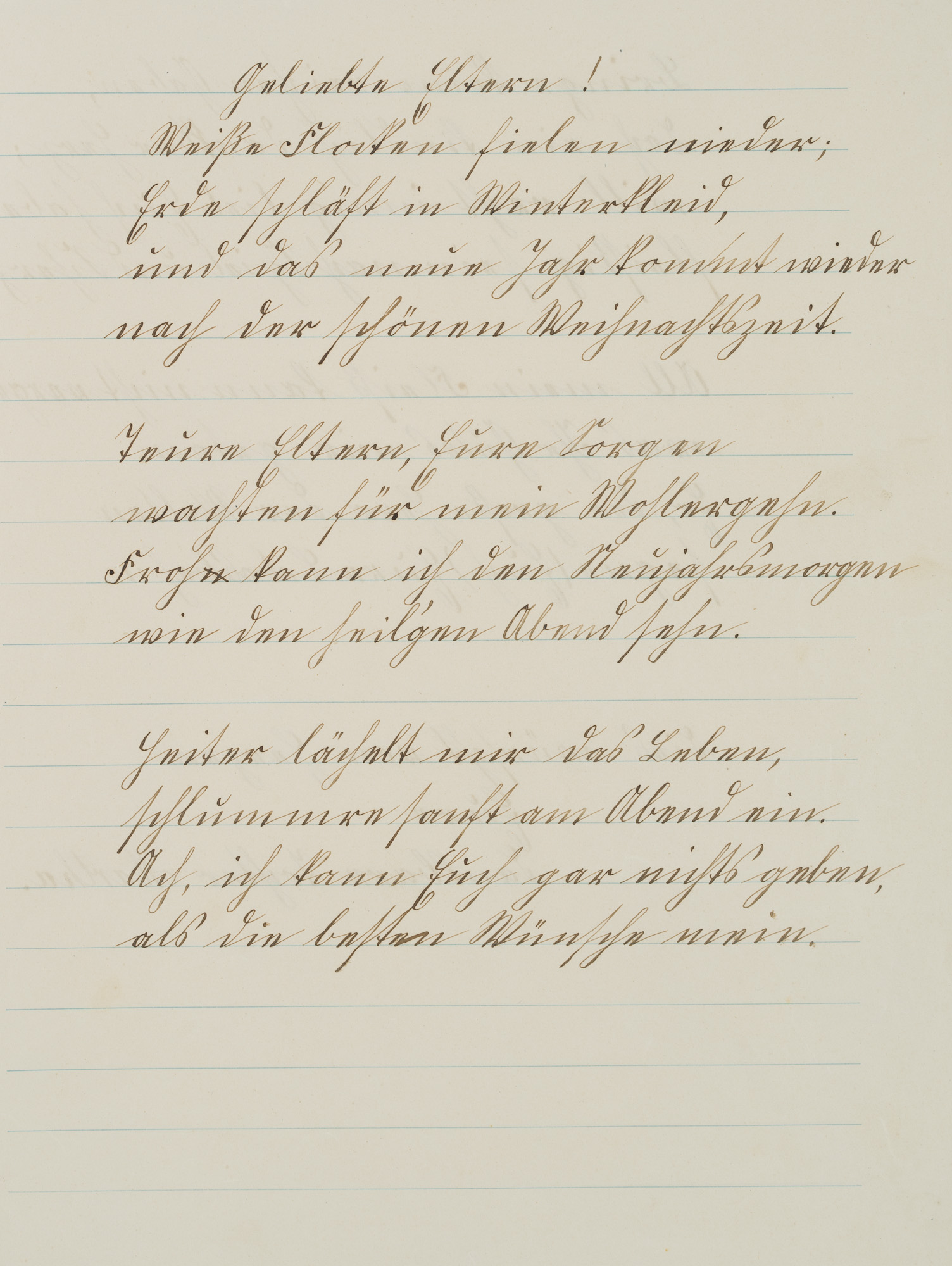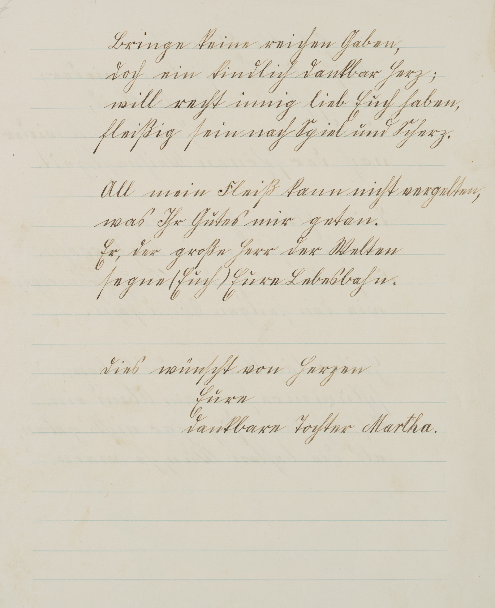 - Beschreibung: Innen und auf der Rückseite mit brauner Tinte handschriftliche Verse und Gruß.