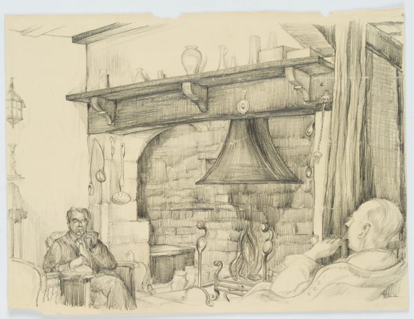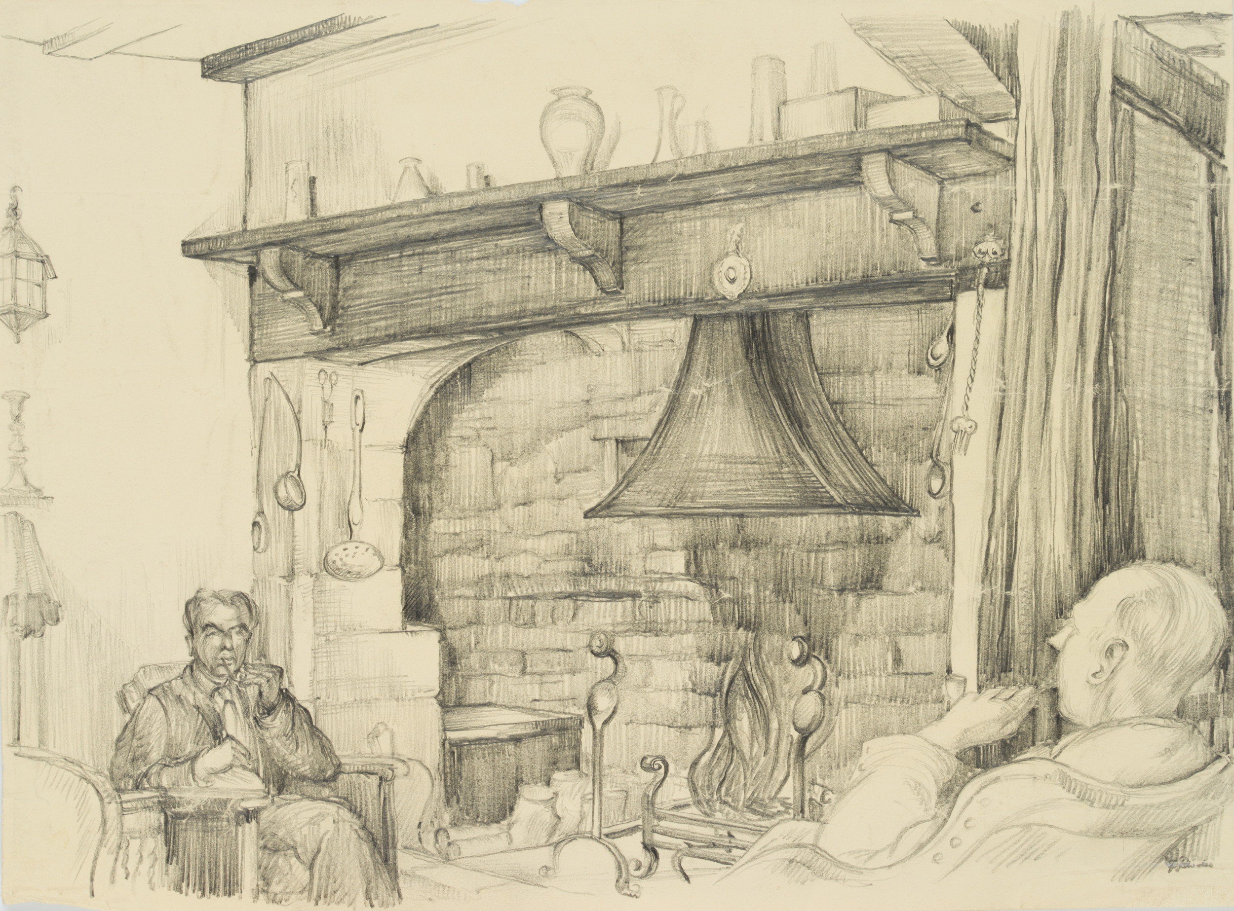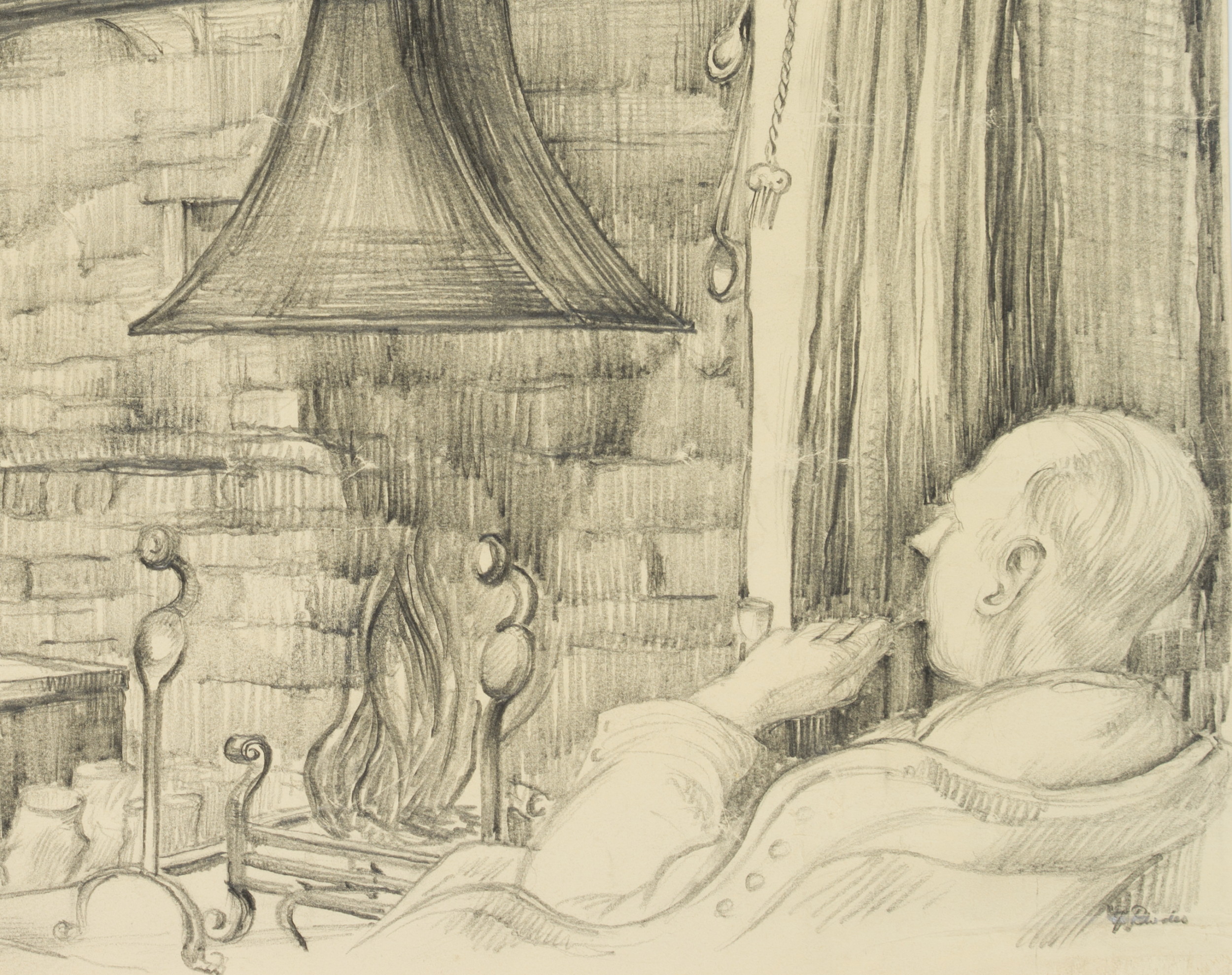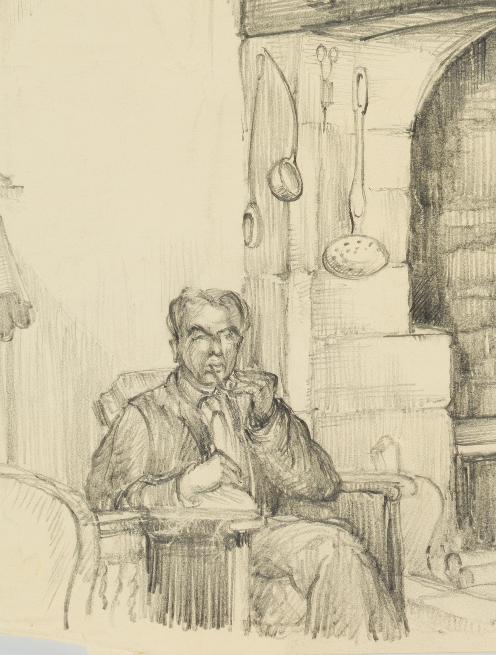 Unknown (20th century), Pipe smoker by the fireplace, c. 1930, Pencil