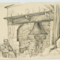 - Description: Rustic interior depiction at a large open fireplace with an old cooking place. In front of it, men sitting in comfortable armchairs smoking pipes.