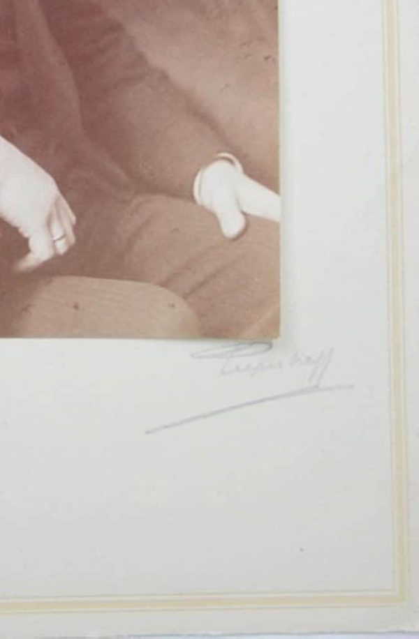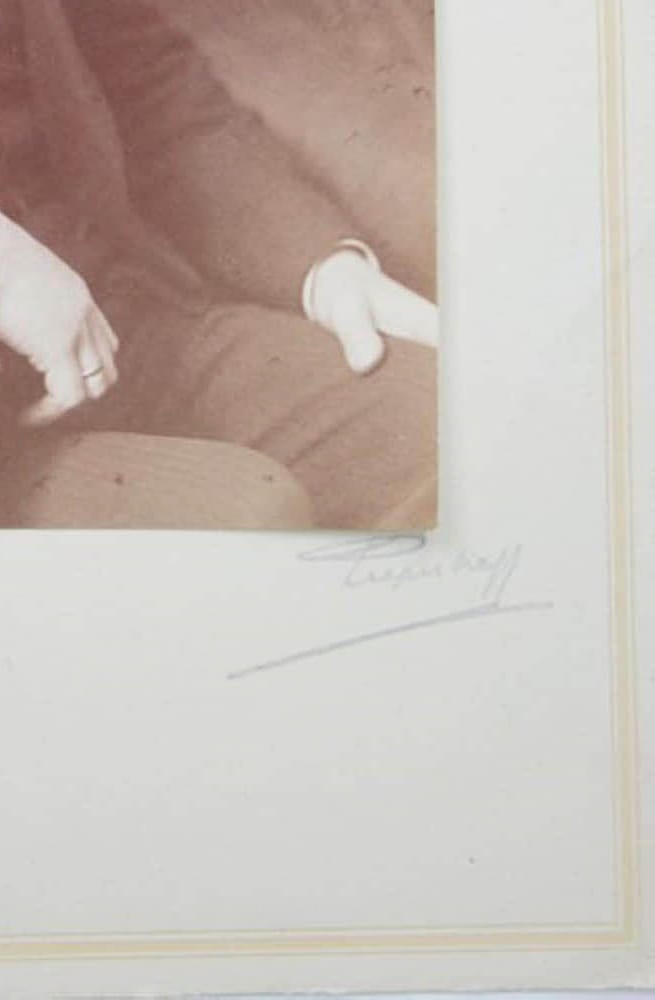 - Beschreibung: Ein sehr schönes Herrenporträt. Ein Herr im Anzug mit Stehkragen und Binokel sitzt in einem Ledersessel und blickt den Betrachter an. Dies ist ein typisches Herrenporträt seiner Zeit und doch verstand Pieperhoff das Foto mit Leben zu füllen. Das Foto ist auf eine signierte Pappe aufgebracht. Aufgrund eines datierten Fotos aus der selben Fotoserie kann dieses Foto mit höchster Wahrscheinlichkeit in das Jahr 1921 datiert werden.