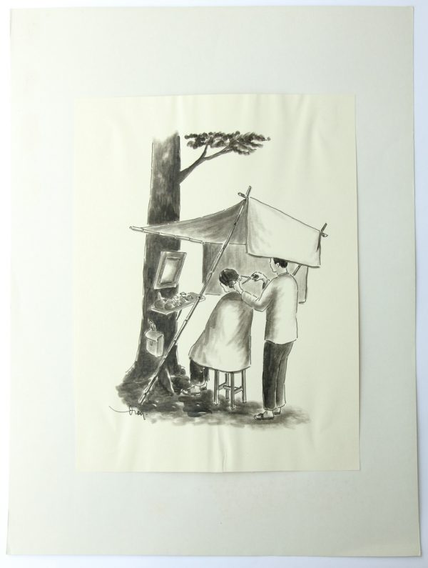Unknown (20th century), Temporary hairdressing stand in an Asian setting, , Indian ink
