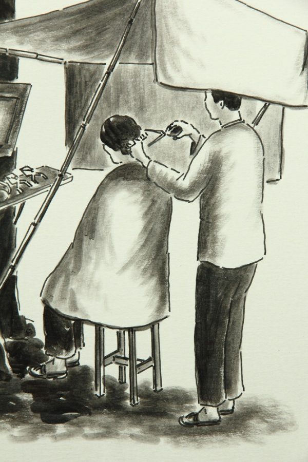 Unbekannt (20. Jahrhundert), Provisorischer Friseurstand in asiatischem Umfeld, , Tusche