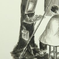 - Description: mounted on strong paper Full-figure depiction of a small barber’s stand on a tree. A light canopy with bamboo struts is attached to the trunk as well as a mirror and a board with utensils. Under the canopy a barber is cutting the hair of a second person in back view.