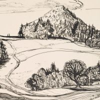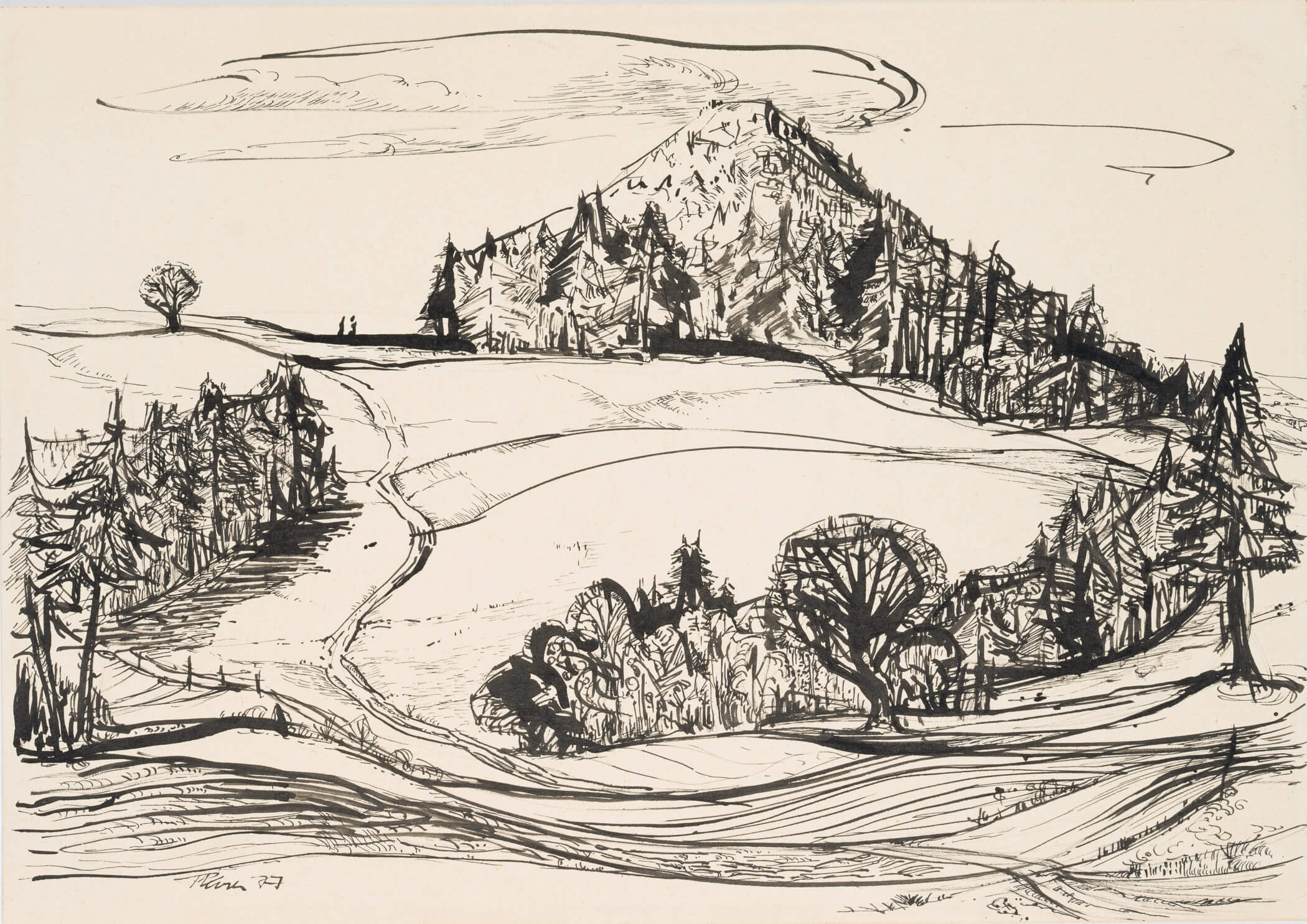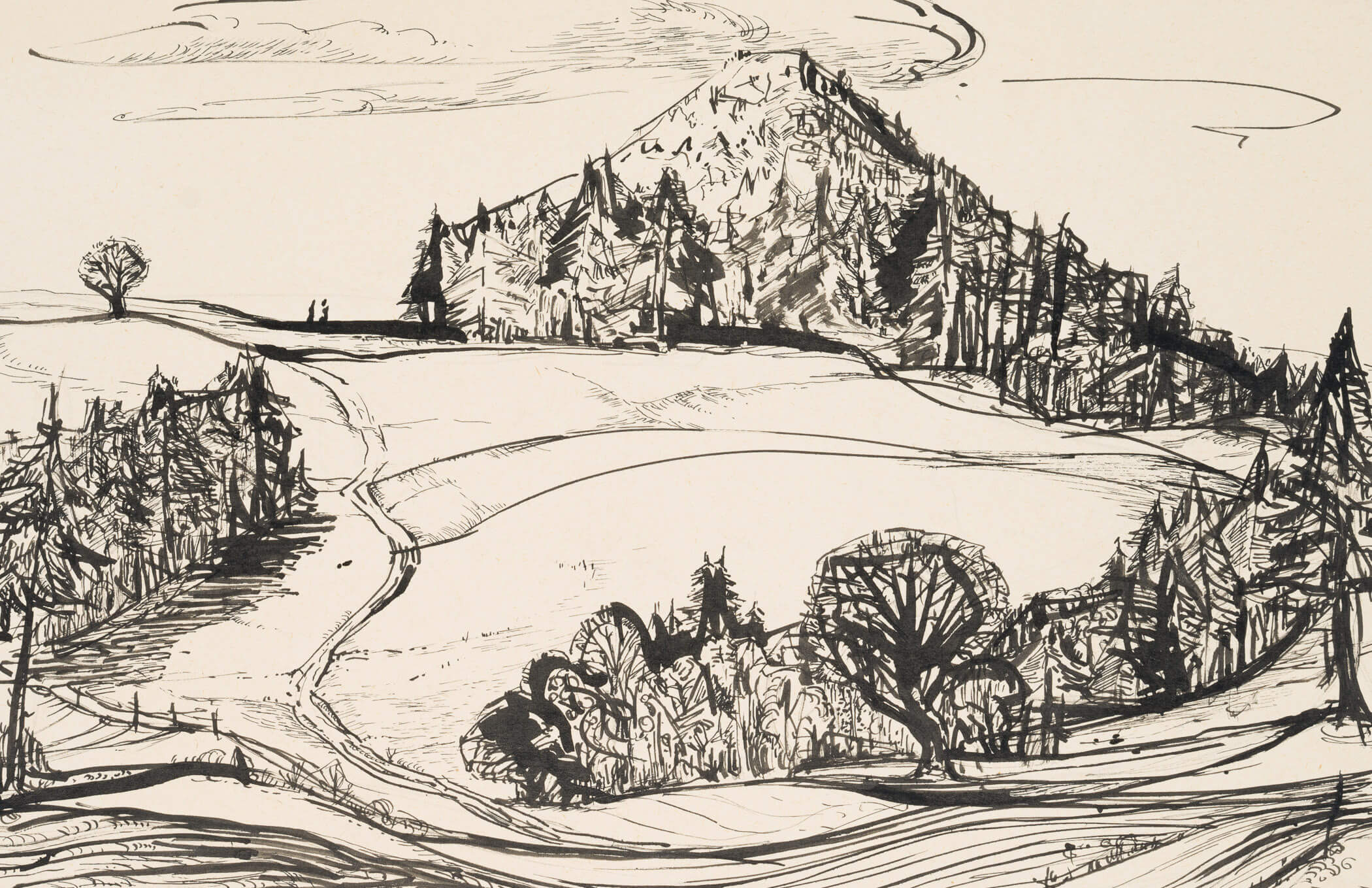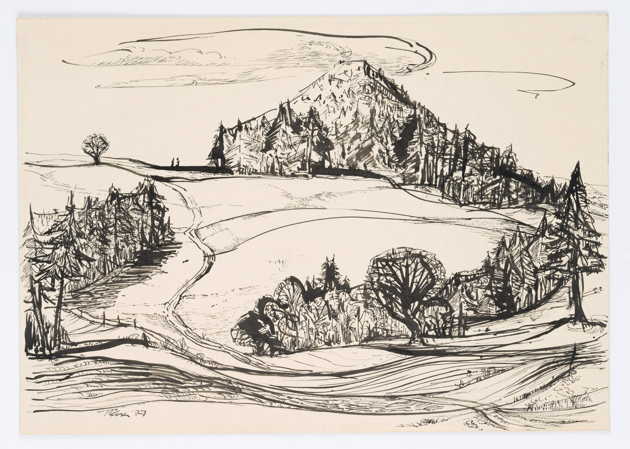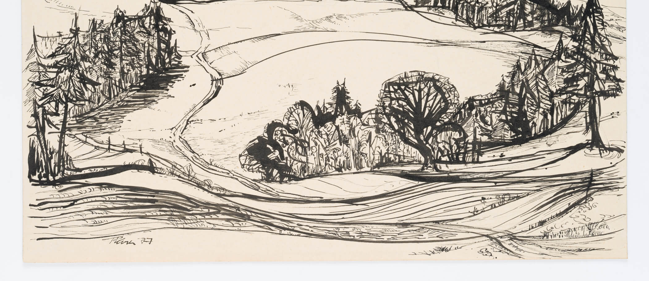 - Bezeichnung: Unten links signiert: “[?]”. Unten links datiert: “77”. Verso von fremder Hand bezeichnet: “Reihersberg Federzeichnung”.