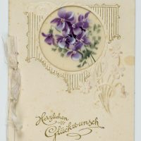 - Beschreibung: Kolorierter Prägedruck. Besondere Präge-Glückwunschkarte mit Veilchen im Medaillon; eingehängtes Doppelblatt mit handschriftlichen Grüßen in Tinte; datiert auf: 2.11.1912
