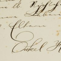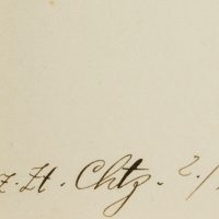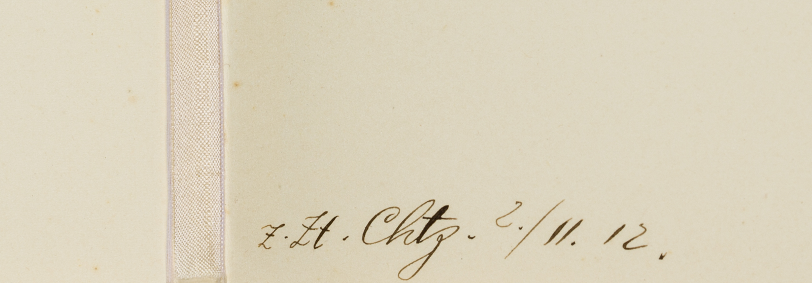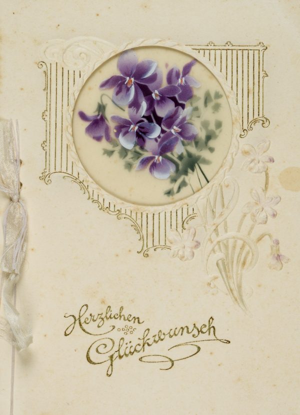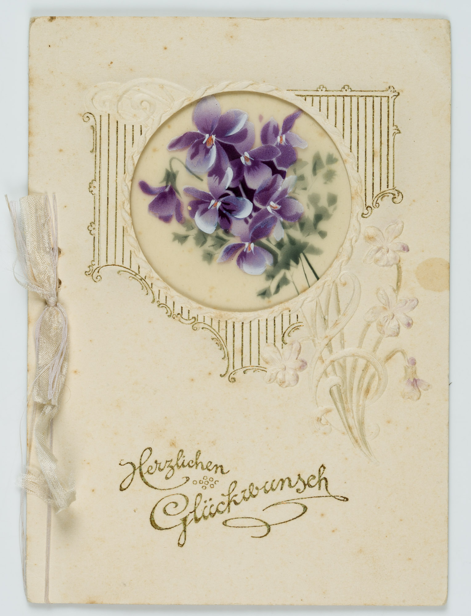 - Description: Coloured relief printing. Special embossed greeting card with violets in medallion; inserted double sheet with handwritten greetings in ink; dated: 2.11.1912.
