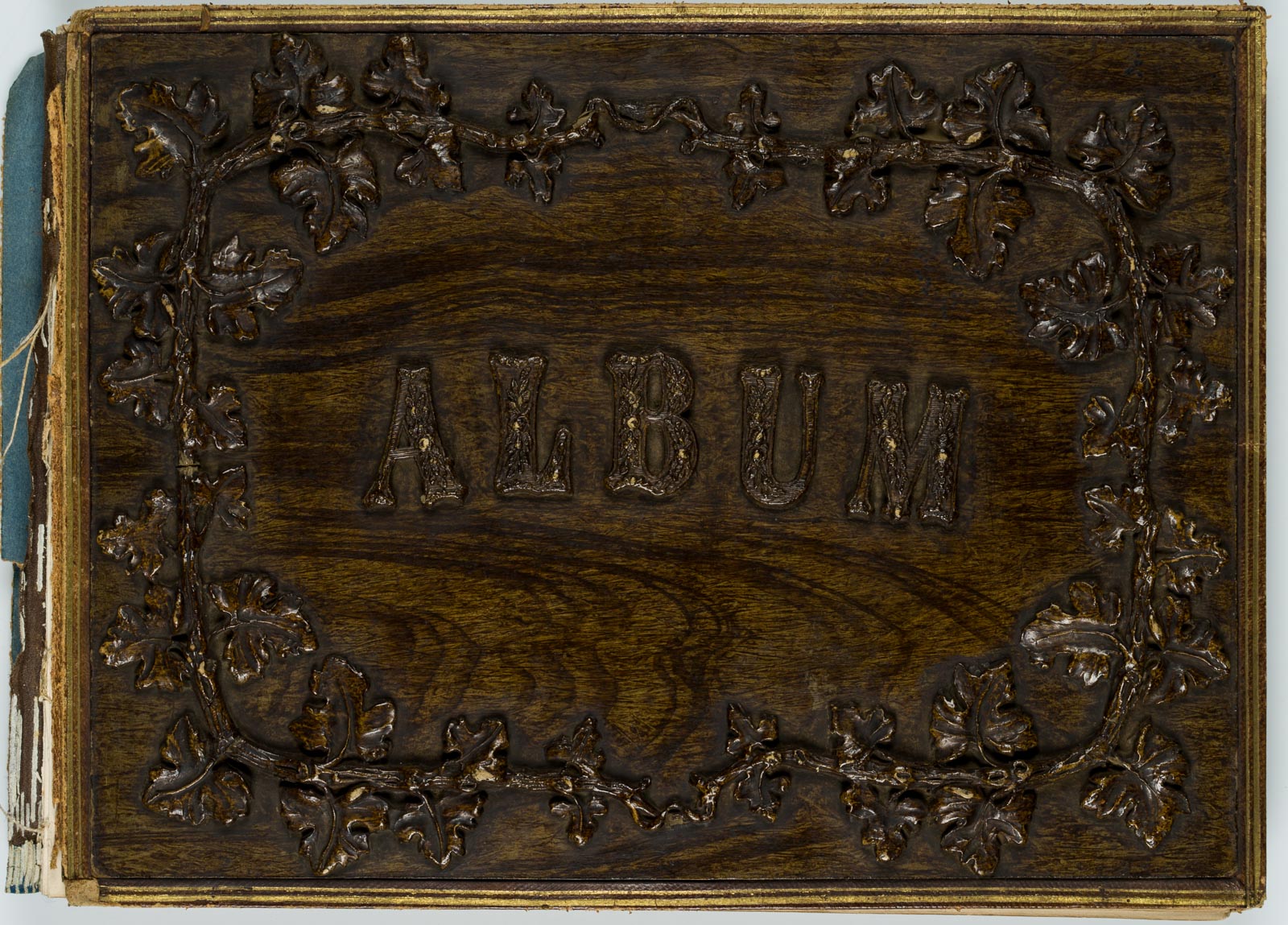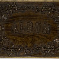 Collector’s album containing reproductions of works of art and architectural details. The album is particularly captivating due to its elaborately carved wooden book cover with vine work.