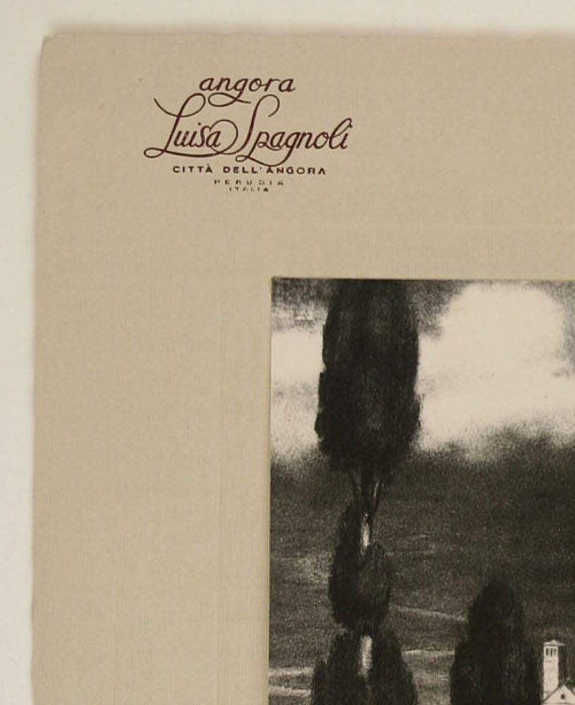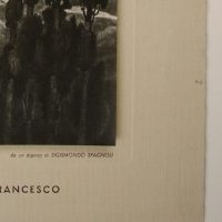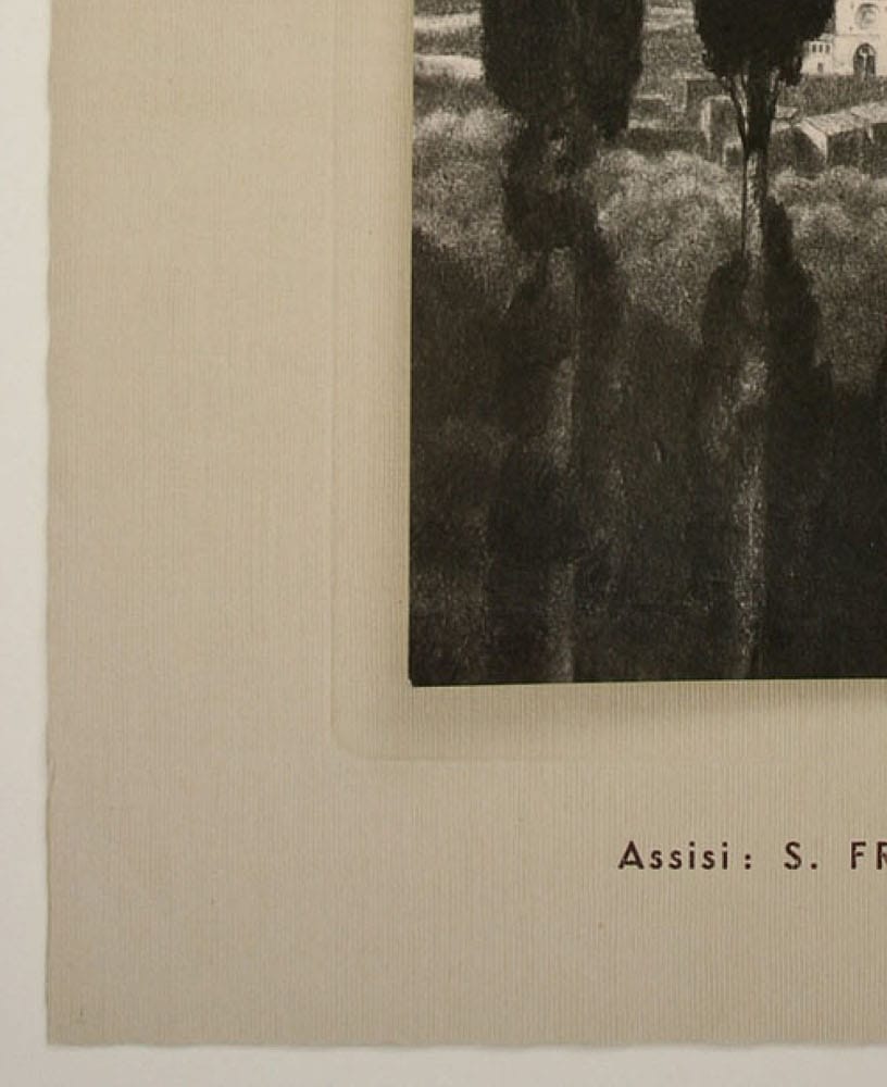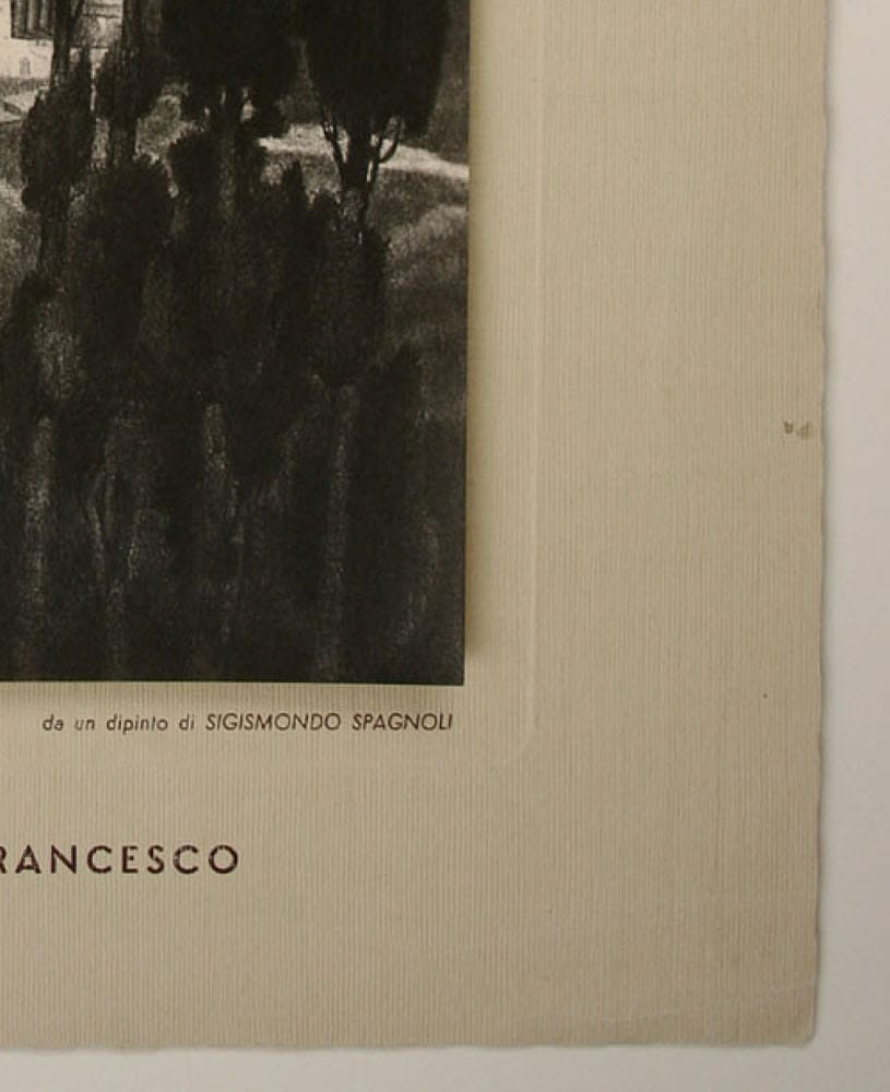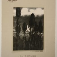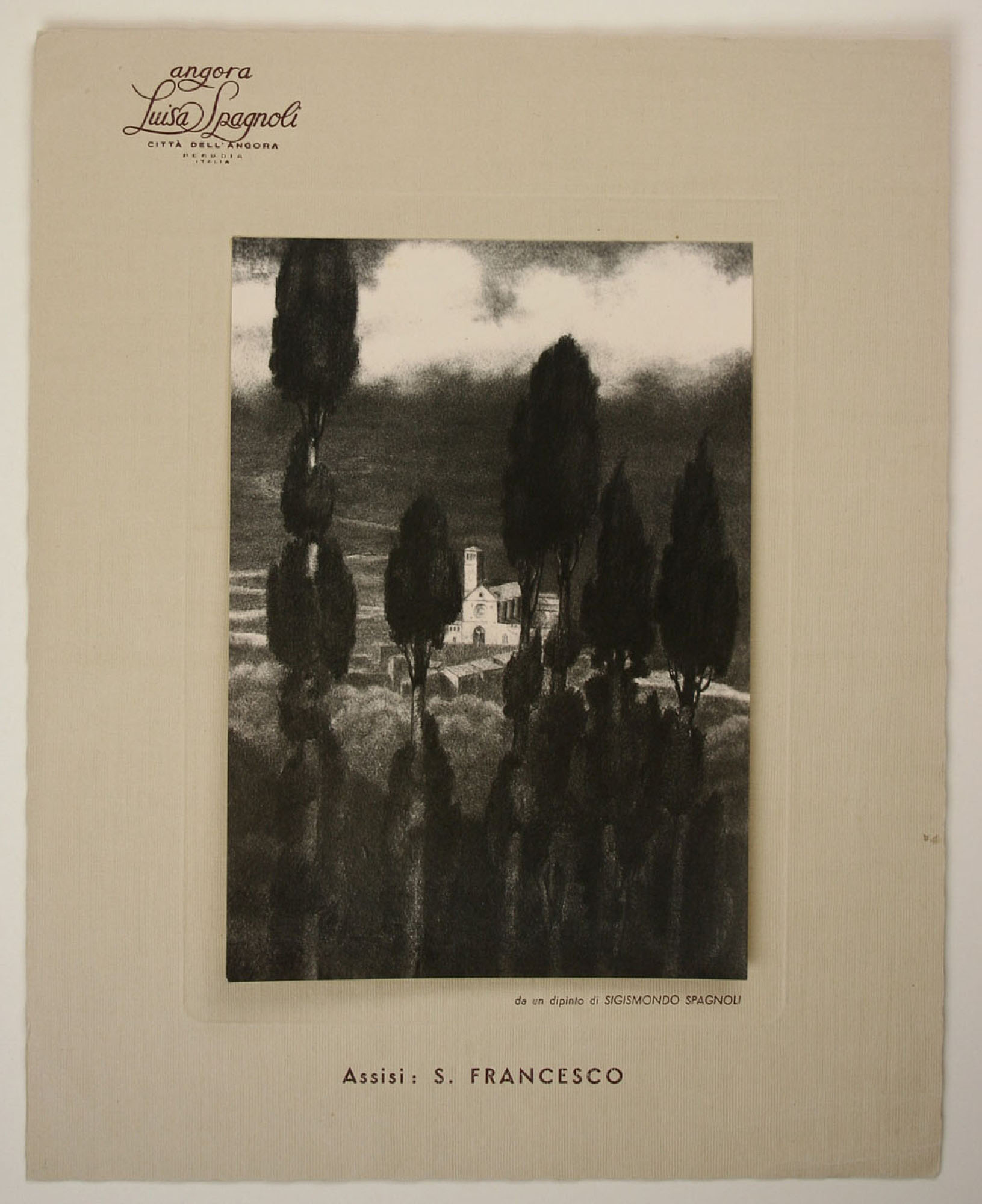 - Description: Reproduction of a painting by Sigismondo Spagnolo, inscribed lower right: “da un dipinto di Sigismondo Spagnoli Assisi: S. Francesco”. Very nice view of the famous Basilica of San Francesco in Assisi. Dark cypress trees in the foreground allow a narrow view of the sunlit facade of San Francesco. The burial church of St. Francis of Assisi is best known for its frescoes by Giotto di Bondone, among others. Severely damaged by the 1997 earthquake, the frescoes have been restored at considerable expense.