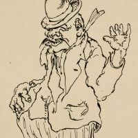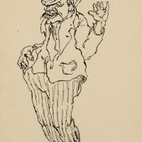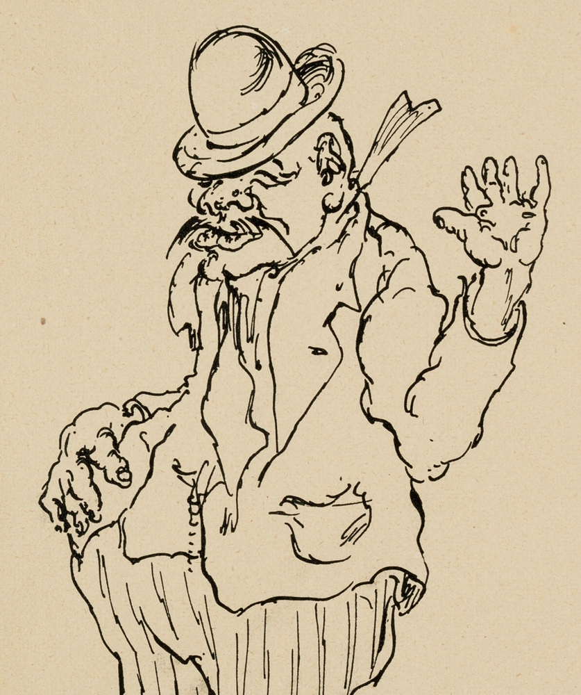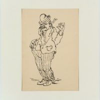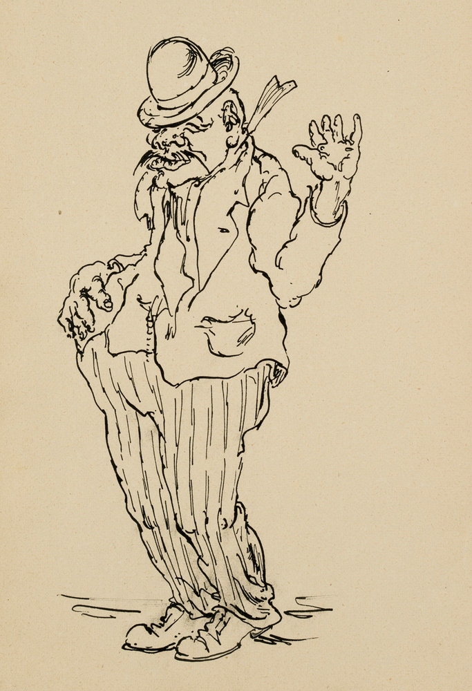 Unknown (20th century), Satirical depiction of a man dressed in a suit and hat, his right hand resting on his hip, the left raised in salute, , Pen drawing