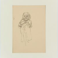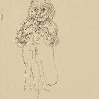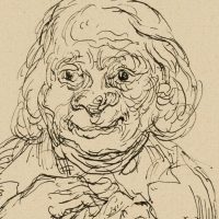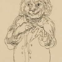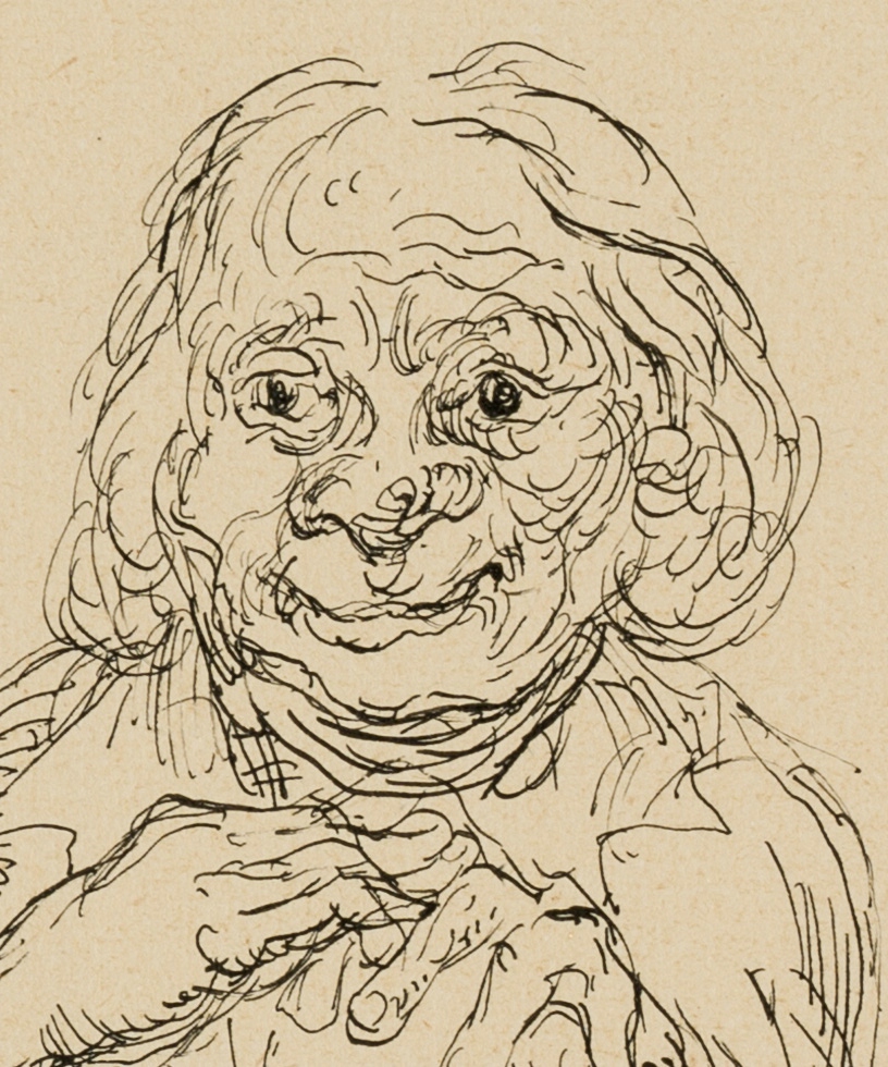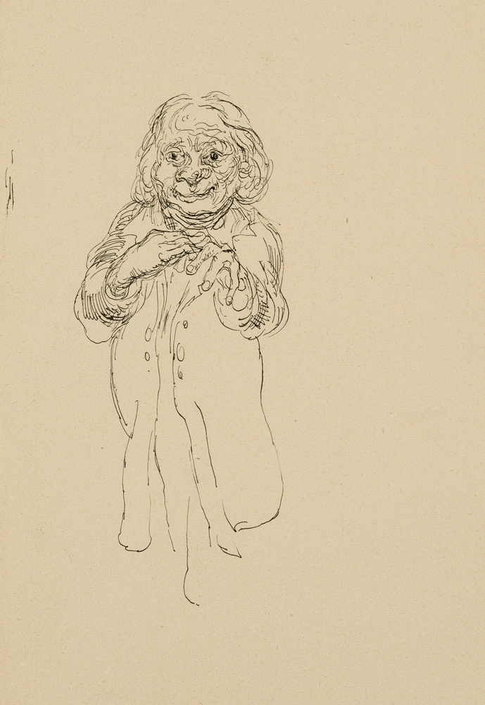 Unknown (20th century), Satirical depiction of an old man, En face, looking out of the picture, the right hand on the lapel, the left reaching out into the room, , Pen drawing