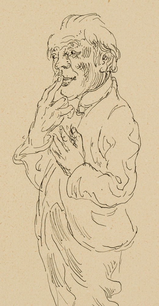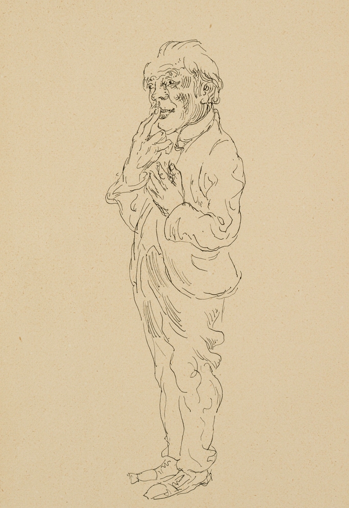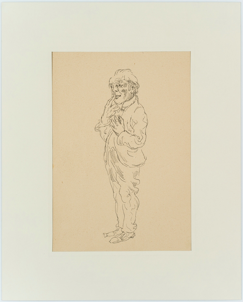 Unknown (20th century), Satirical depiction of a man, dressed in a suit, in three-quarter view, right hand brought to his mouth, , Pen drawing