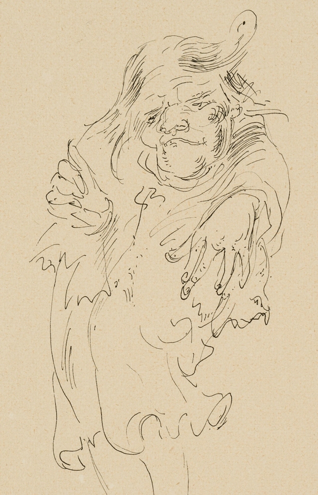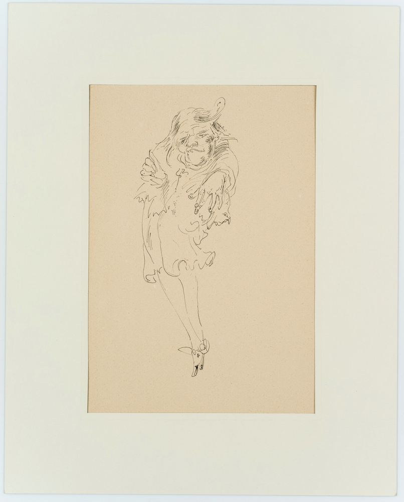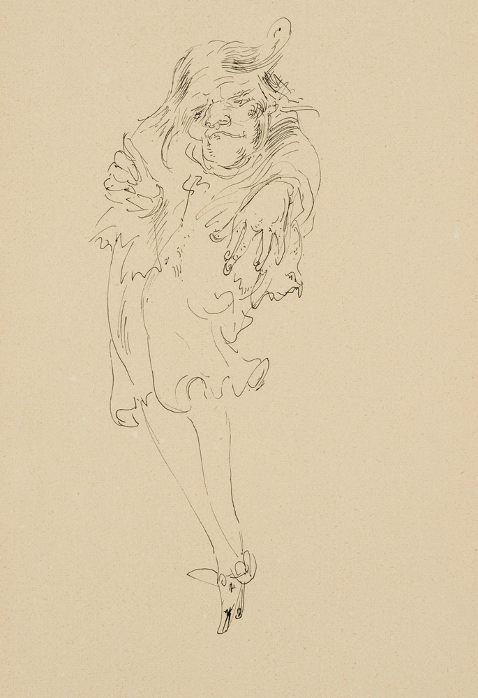 Unknown (20th century), Satirical depiction of a man, dressed in a dress with flowing hem, standing on tiptoe, , Pen drawing