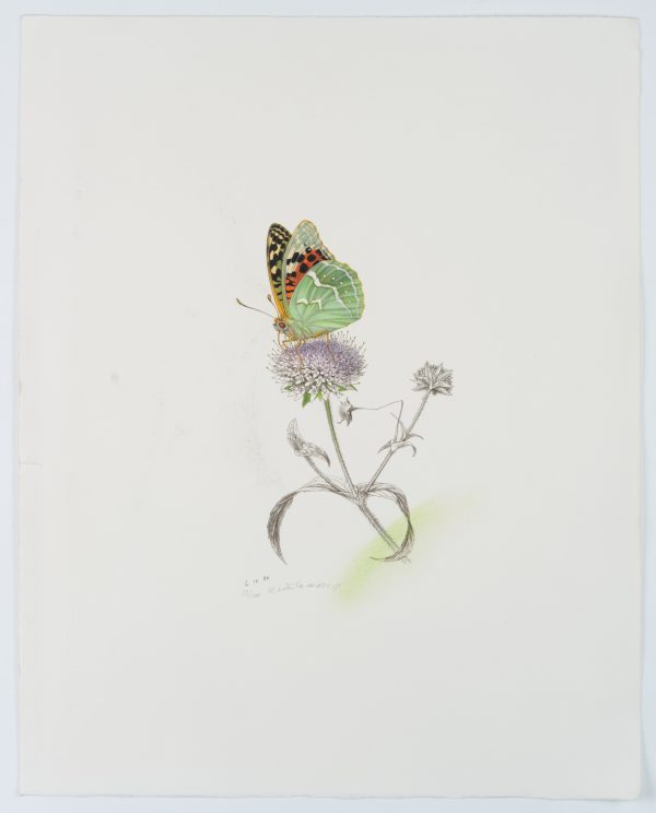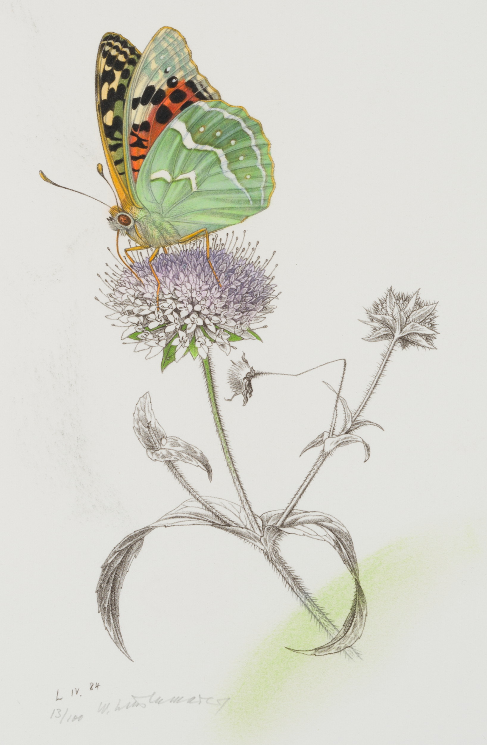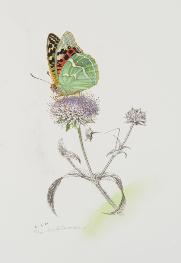 Unbekannt (20. Jahrhundert), Bunter Schmetterling auf Strohblume, 1984, Lithographie