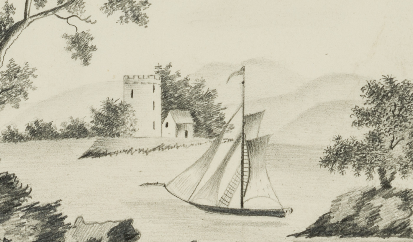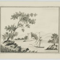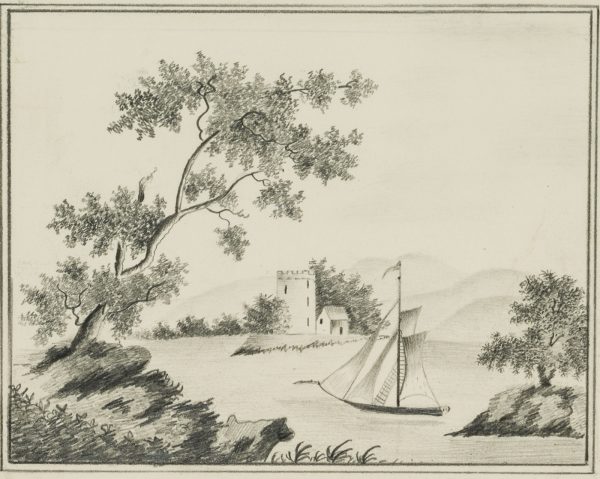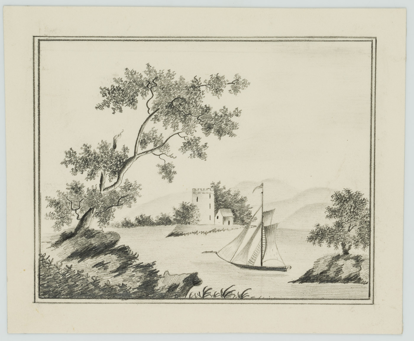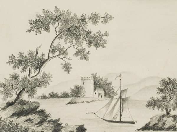 Unknown (20th century), Sailboat in front of a castle tower, c. 1900, Pencil