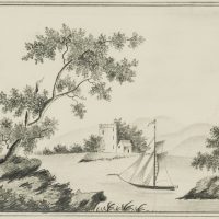 - Description: Standing on the shore of a lake or body of water, the viewer recognises a small sailboat. The surface of the water lies very still. In the middle ground there is a headland with a small house and a tower, which probably once belonged to a castle or fortification. In the background are the gentle hills of a mountain range.