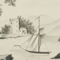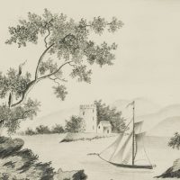 - Beschreibung: Am Ufer eines Sees oder Gewässers stehend, erkennen die Betrachtenden ein kleines Segelboot. Die Oberfläche des Wasser liegt ganz still da. Im Mittelgrund dann eine Landzunge mit einem kleinen Häuschen und einem Turm, der wohl einst zu einer Burg- oder Befestigungsanlage gehörte. Im Hintergrund die sanften Hügel eines Gebirges.