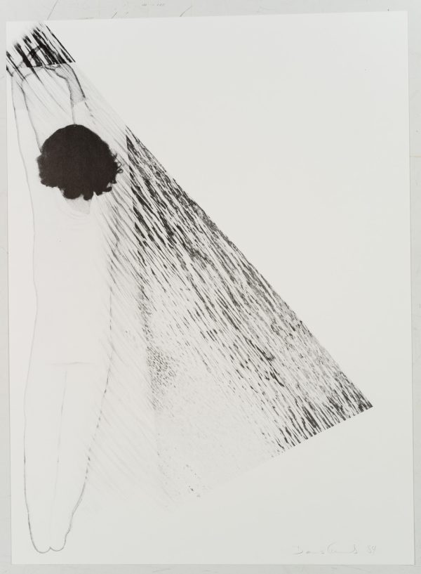 - Beschreibung: Rätselhafte Darstellung. Eine sich entlang des rechten Bildrands schmiegende Rückenfigur trägt einen weißen Anzug. Sie hat sich aufgerichtet, die Arme erhoben und scheint im nächsten Moment dem Bild zu entgleiten. Der luftige, schwarz-weiß gemaserte Farbstreifen, der sich aus ihrer Gestalt entfaltet, erinnert an weiße Flügel. Eine ätherische Leichtigkeit scheint das Bild zu verbreiten.