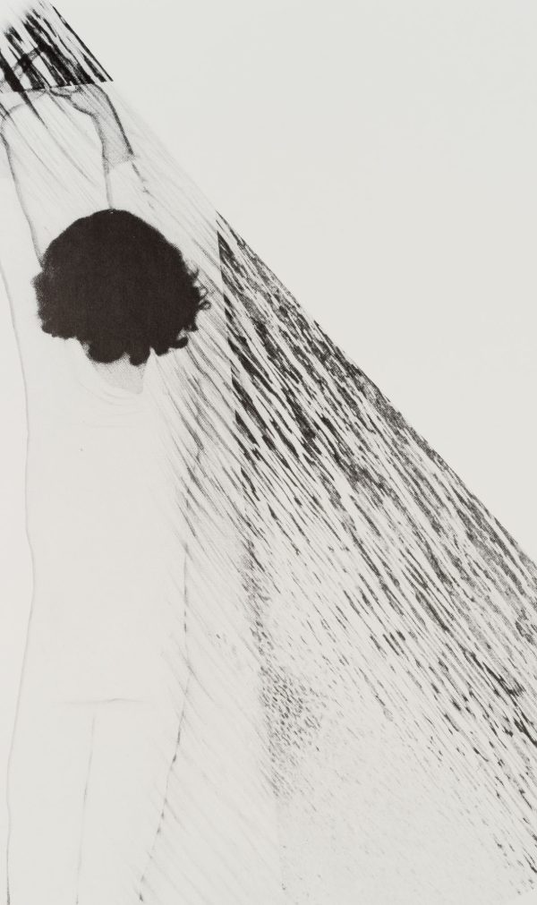 - Description: Enigmatic depiction. A back figure nestling along the right edge of the picture wears a white suit. She has straightened up, raised her arms and in the next moment seems to slip out of the picture. The airy, black and white grained colour strip that unfolds from her figure is reminiscent of white wings. The picture seems to spread an ethereal lightness.