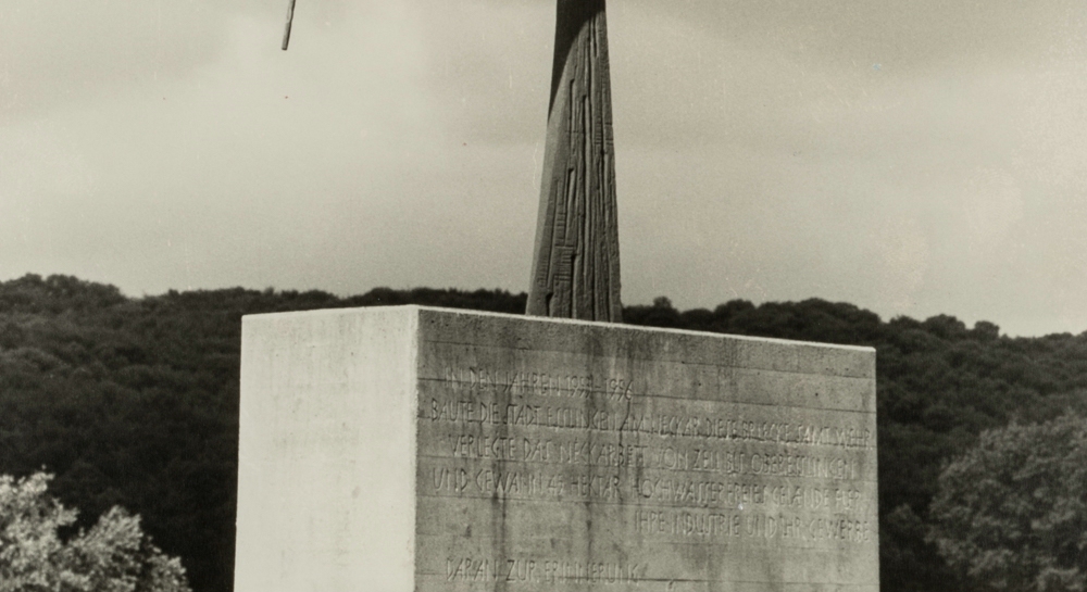 - Description: Artful photograph of the monument of an abstract ferryman on a bridge over the Neckar in Oberesslingen. Inscription partly visible on the pedestal: “In the years 1953-1996, the city of Esslingen on the Neckar built this bridge including weir, shifted the Neckar bed from Zell to Oberesslingen and gained 45 hectares of flood-free land for its industry and commerce […]”.