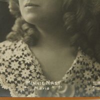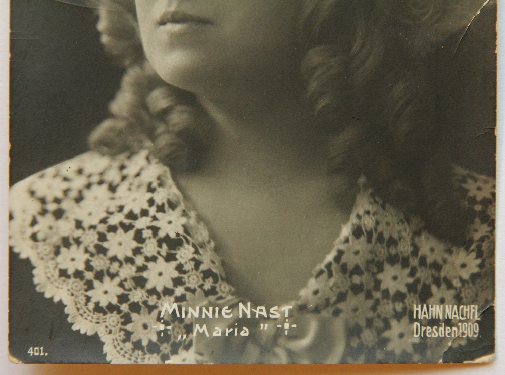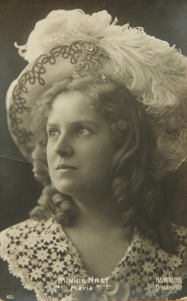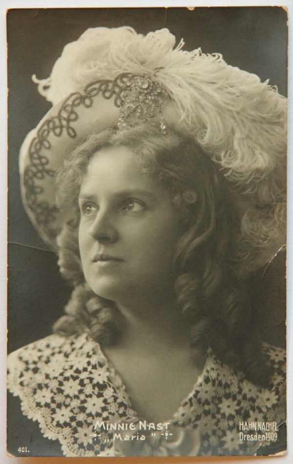 - Description: Photogravure print on strong paper as a postcard. Half-profile portrait. The sitter wears her curly hair open and over it an elaborate, feather-adorned hat. Over her shoulder is a white lace fabric. Minnie Nast ranks among the great German opera singers of the early 20th century. After her musical studies at the Baden Conservatory in Karlsruhe, she made her singing debut in Aachen in 1897. She embarked on a successful career that took her to stages in Canada, the United States of America, Russia, the Netherlands and Great Britain, among other places. Until 1919, the soprano sang regularly at the Semper Opera in Dresden. After that she taught singing in Dresden until 1945. Minnie Nast is known for her lively and light embodiments of soubrette roles, especially in Mozart operas. She gave an outstanding performance on January 26, 1911 when she sang the role of Sophie in the world premiere of Richard Strauss’ Der Rosenkavalier. Through surviving sound recordings, one can still experience her clear and enchanting voice today. At the lower edge of the image is the name of the photo studio Hahn Nachfl. Dresden with a date of 1909. Below this is the number 401. This is a postcard from the publishing house of Gebrüder Schelzel Dresden.
