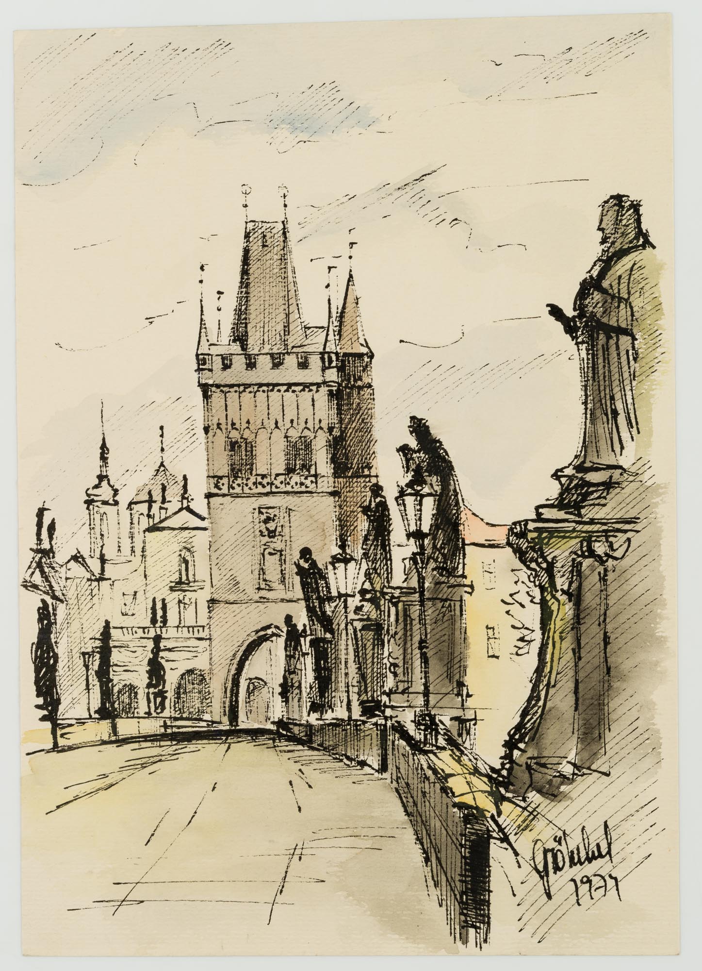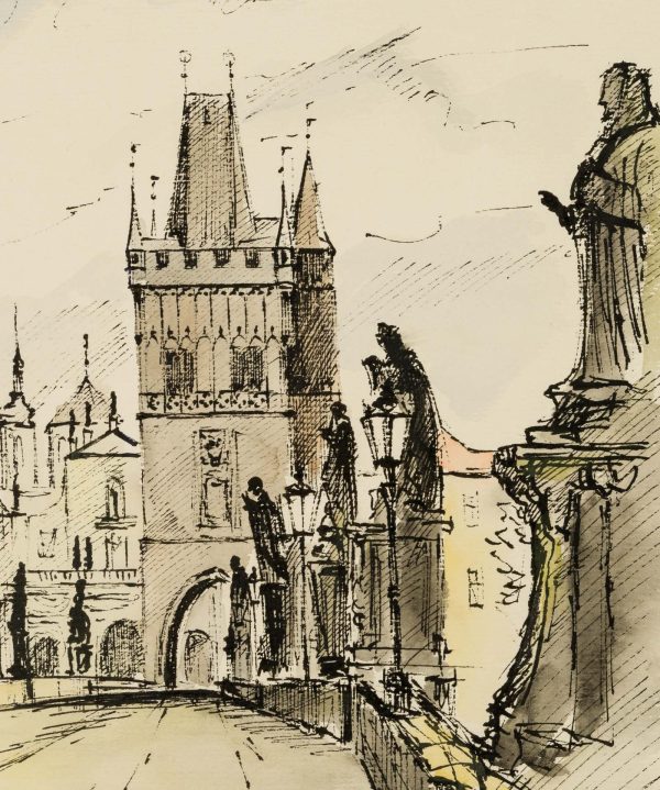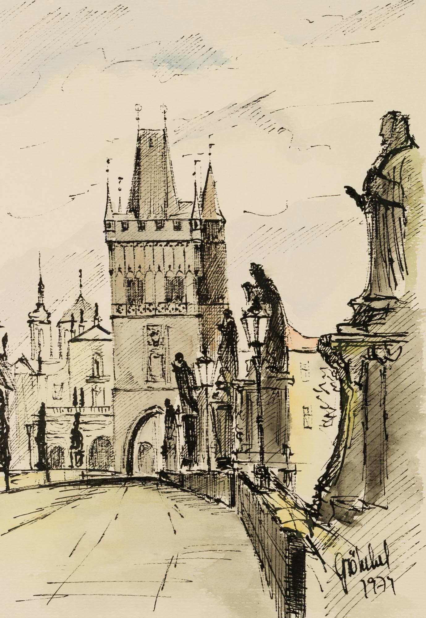 Unknown (20th century), City view of Prague with Charles Bridge and Old Town Bridge Tower, 1971, Pen drawing