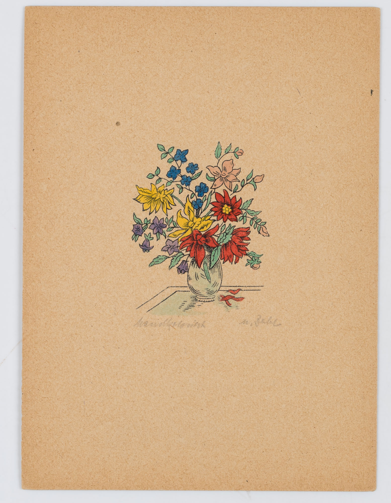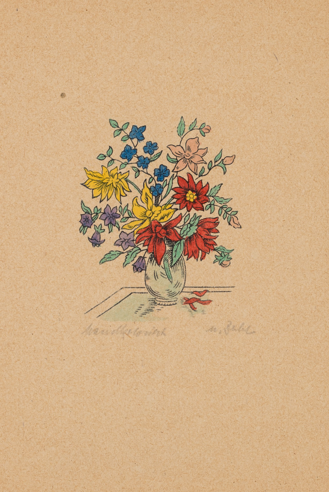 Unbekannt (20. Jahrhundert), Stillleben mit buntem Blumenstrauß, , Holzschnitt