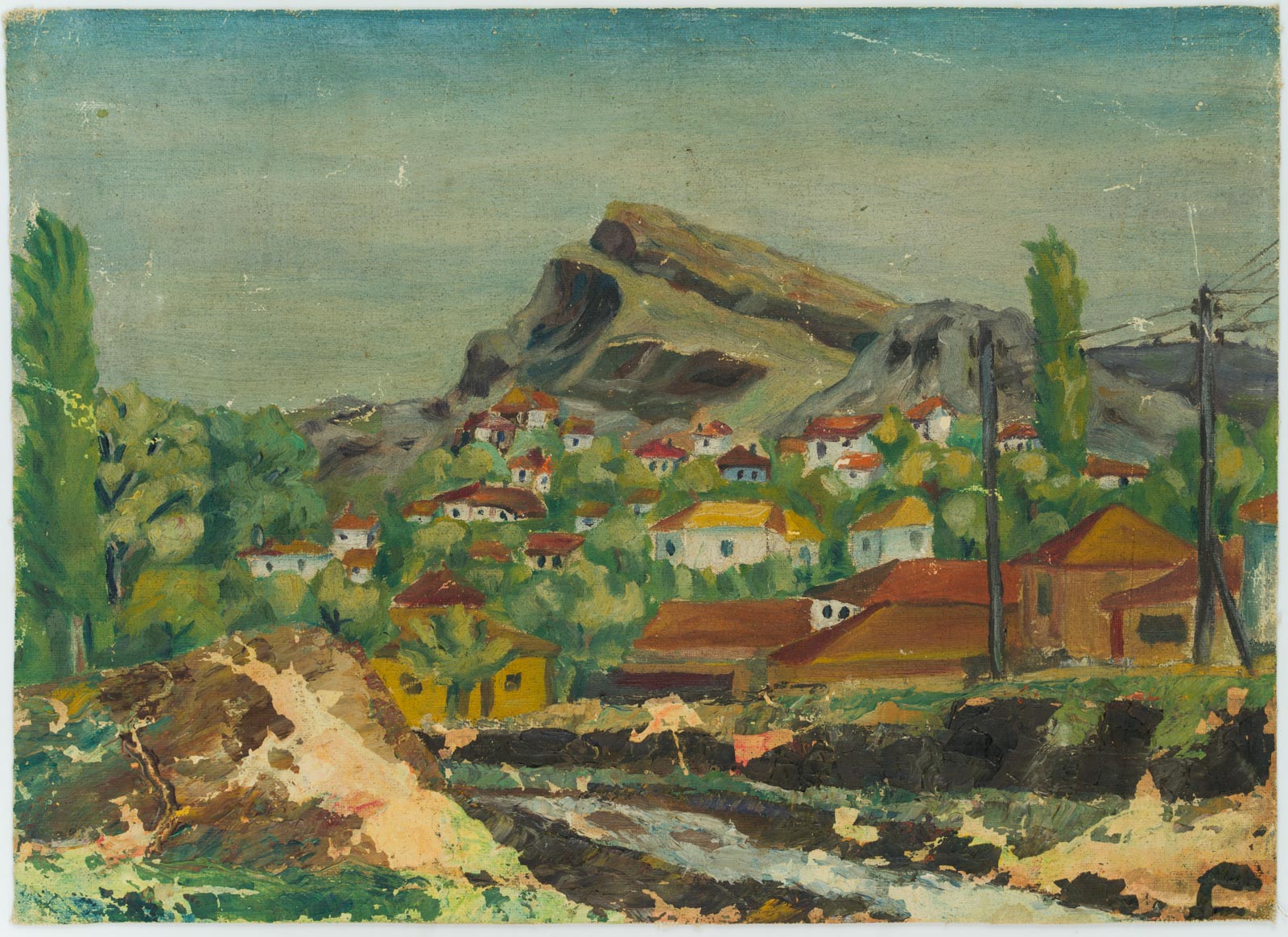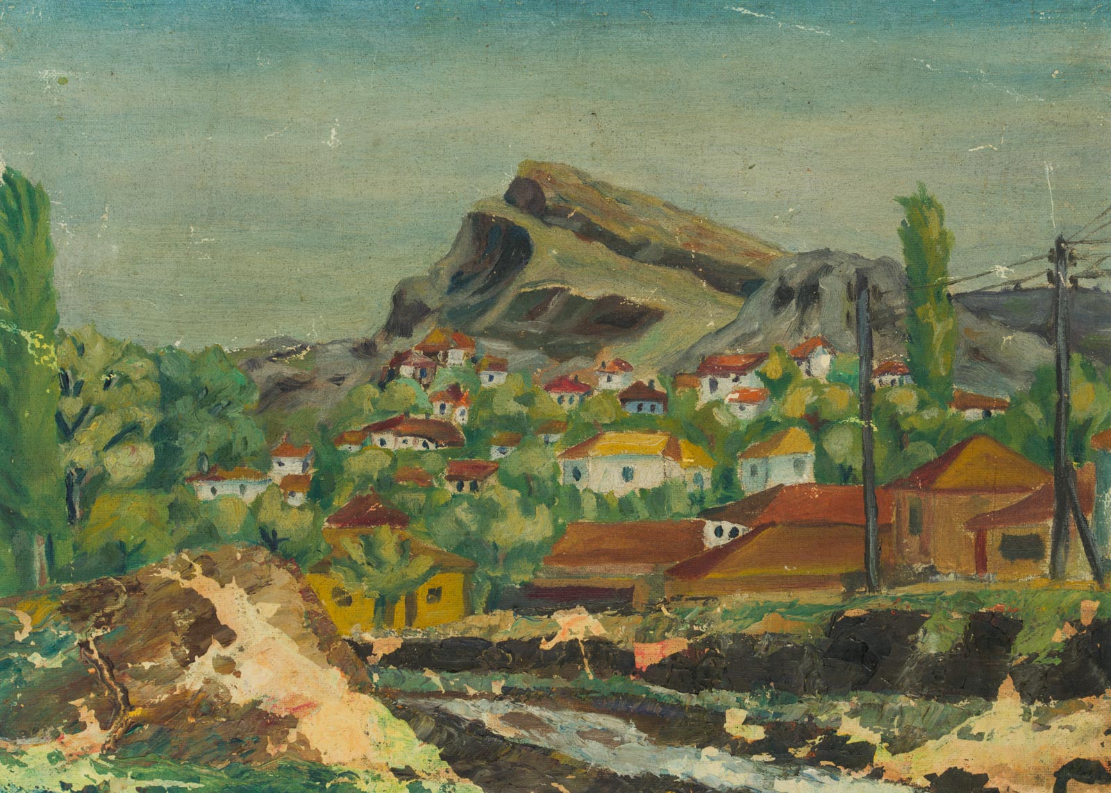 Unbekannt (20. Jahrhundert), Südliche Landschaft mit Dorfansicht, , Öl