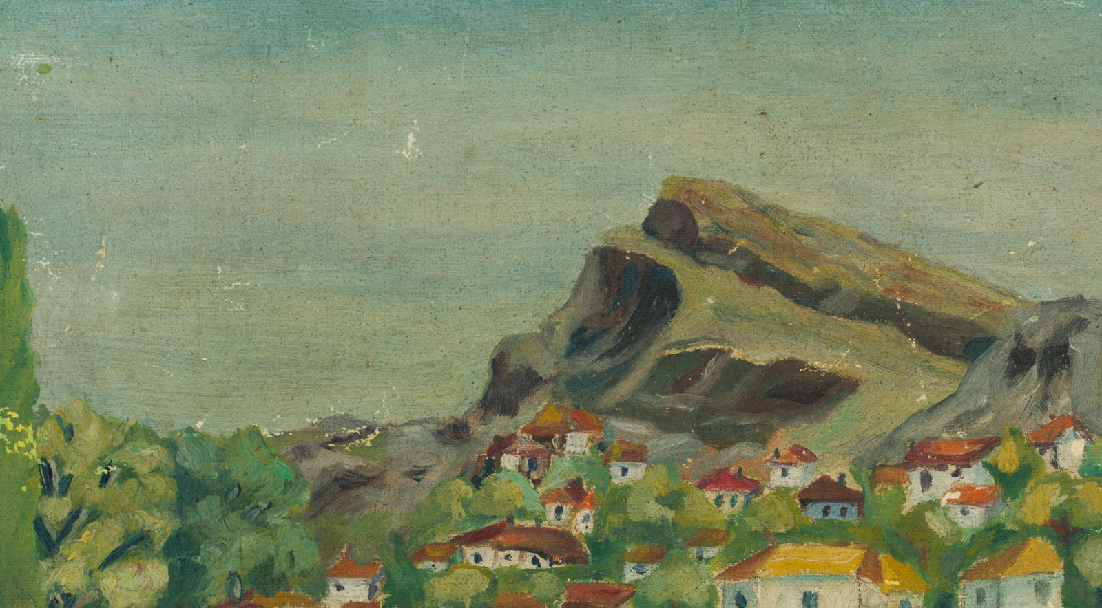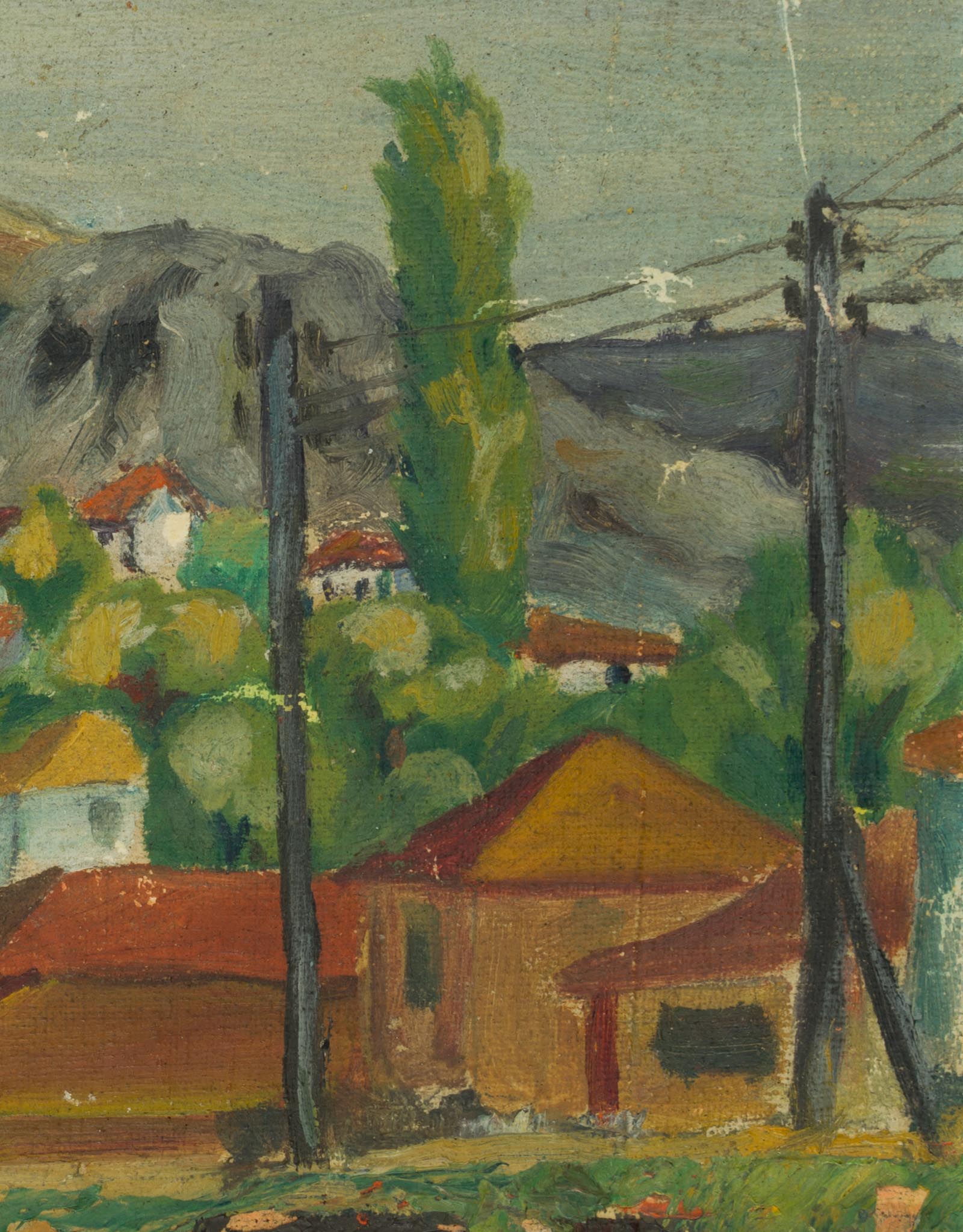- Beschreibung: Ohne Bezeichnung. Aus einiger Entfernung blicken die Betrachtenden auf ein kleines Dorf am Fuße eines Massivs. Die Häuser, halb verdeckt von Baumkronen, schmiegen sich an einen Hügel, hinter dem sich der Gipfel eines Berges zu erkennen gibt. Im Vordergrund sind Elektrizitätsleitungen zu erkennen, sie bilden einen deutlichen Kontrast zur markanten Landschaft im Hintergrund.