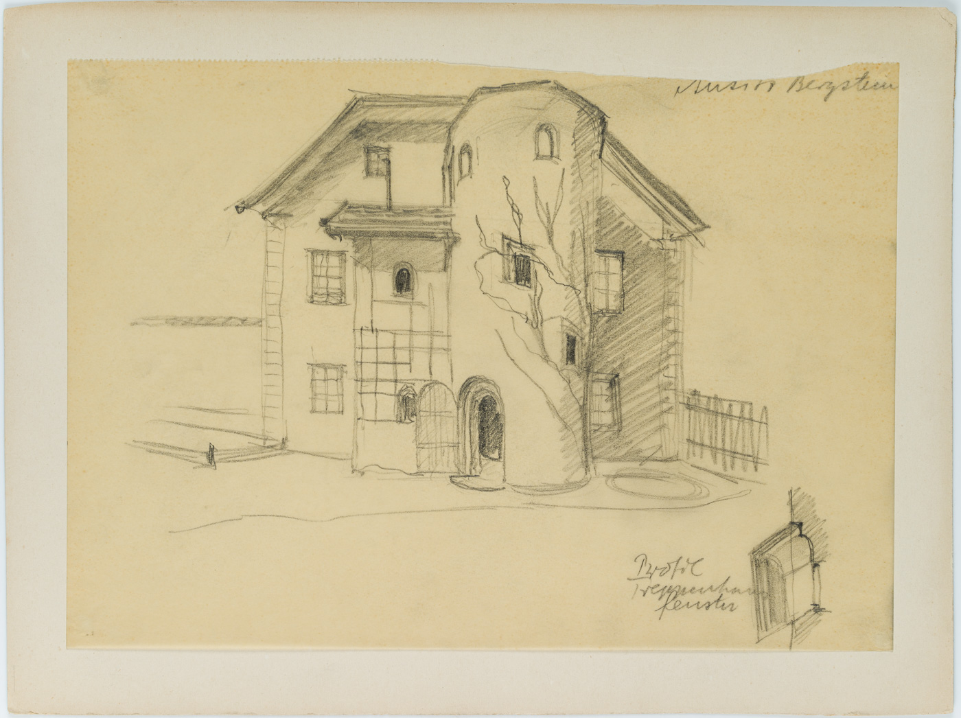 Unbekannt (20. Jahrhundert), Tiroler Bauernhaus mit Rundturm, , Bleistift