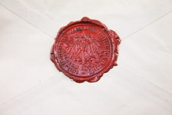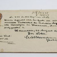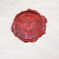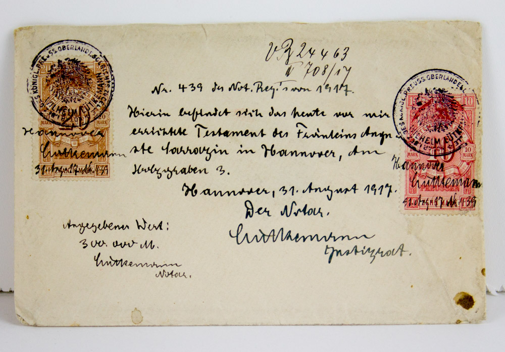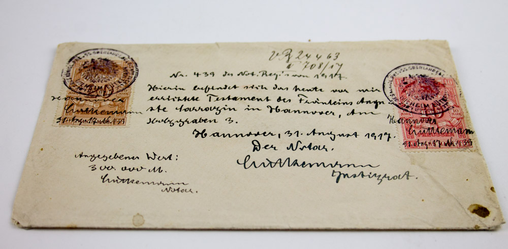 - Beschreibung: Der Briefumschlag ist auf der Vorderseite mit zwei Briefmarken, sowie dem Stempel des Notars versehen. Die Informationen zu dem Testament sind fein säuberlich auf den Umschlag geschrieben. Der Umschlag ist gesiegelt. Das Siegel ziert ein Wappenadler. Im Siegel selber steht ‘Notar Bei. des Königl. Preuss. Oberlandesgerichts zu Gelle’ & ‘Wilhelm Lütkemann’. Das Testament ist nicht vorhanden.