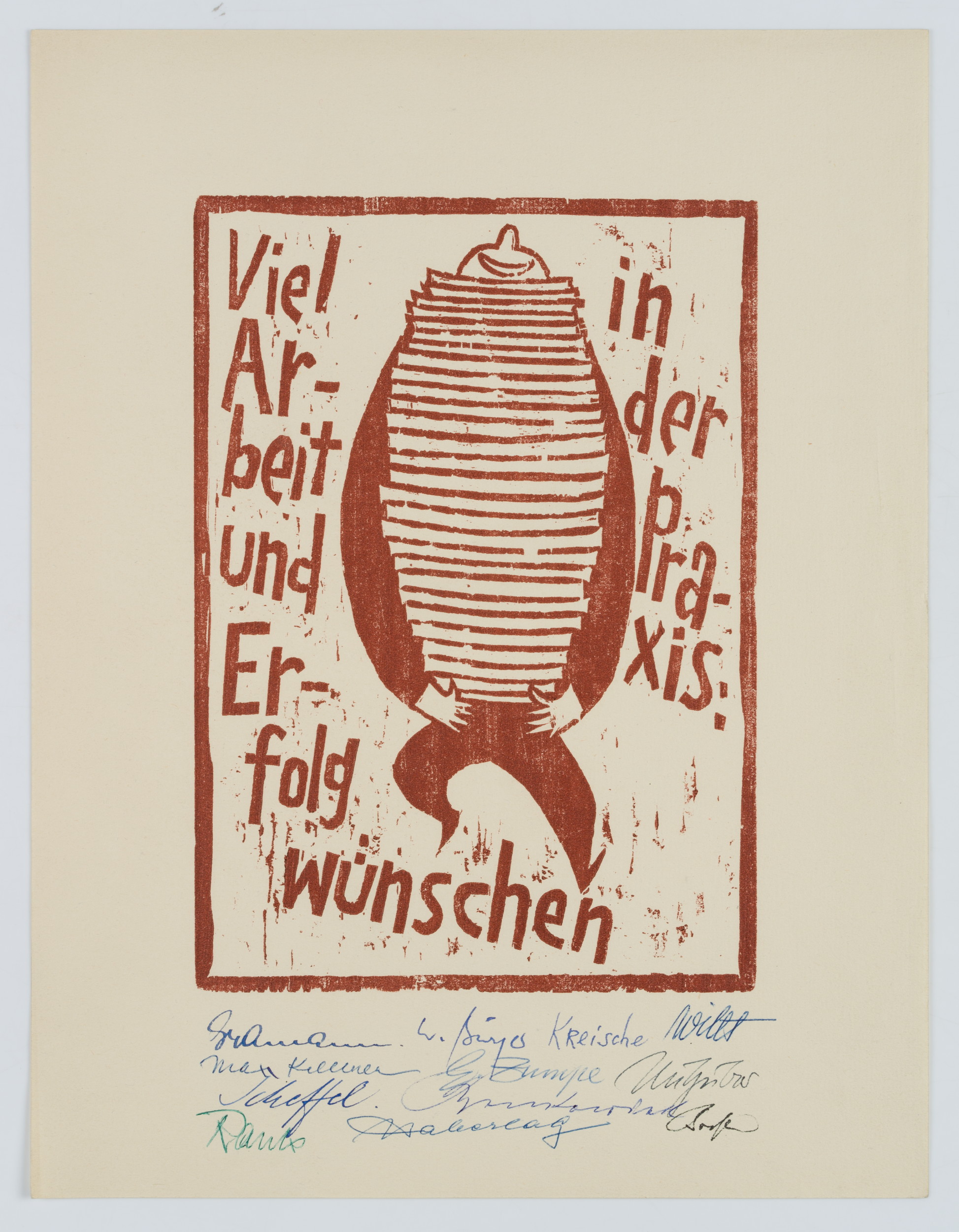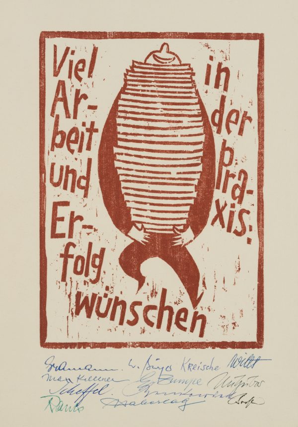 Unbekannt (20. Jahrhundert), Viel Arbeit und Erfolg in der Praxis, Glückwunschkarte zur Gründung, , Holzschnitt